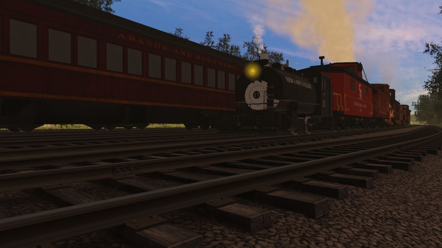 Tags: Trainz Railroad Simulator 2019, Aragon & Southern, 0-4-0T New Hope Valley 17, NKP Mikado Engine V2, NS ES44AC SOU Heritage 8099, NS ES44AC NS Heritage 8114, A&S Baldwin S12 #22, A&S 0-6-0T Engine, A&S 31 Engine, A&S Plymouth 7, A&S Ex-ACE 3000 Coach, A&S Ex-N&W Coach, N&W NS Powhatan Arrow 05 P3 Standard Coach 538