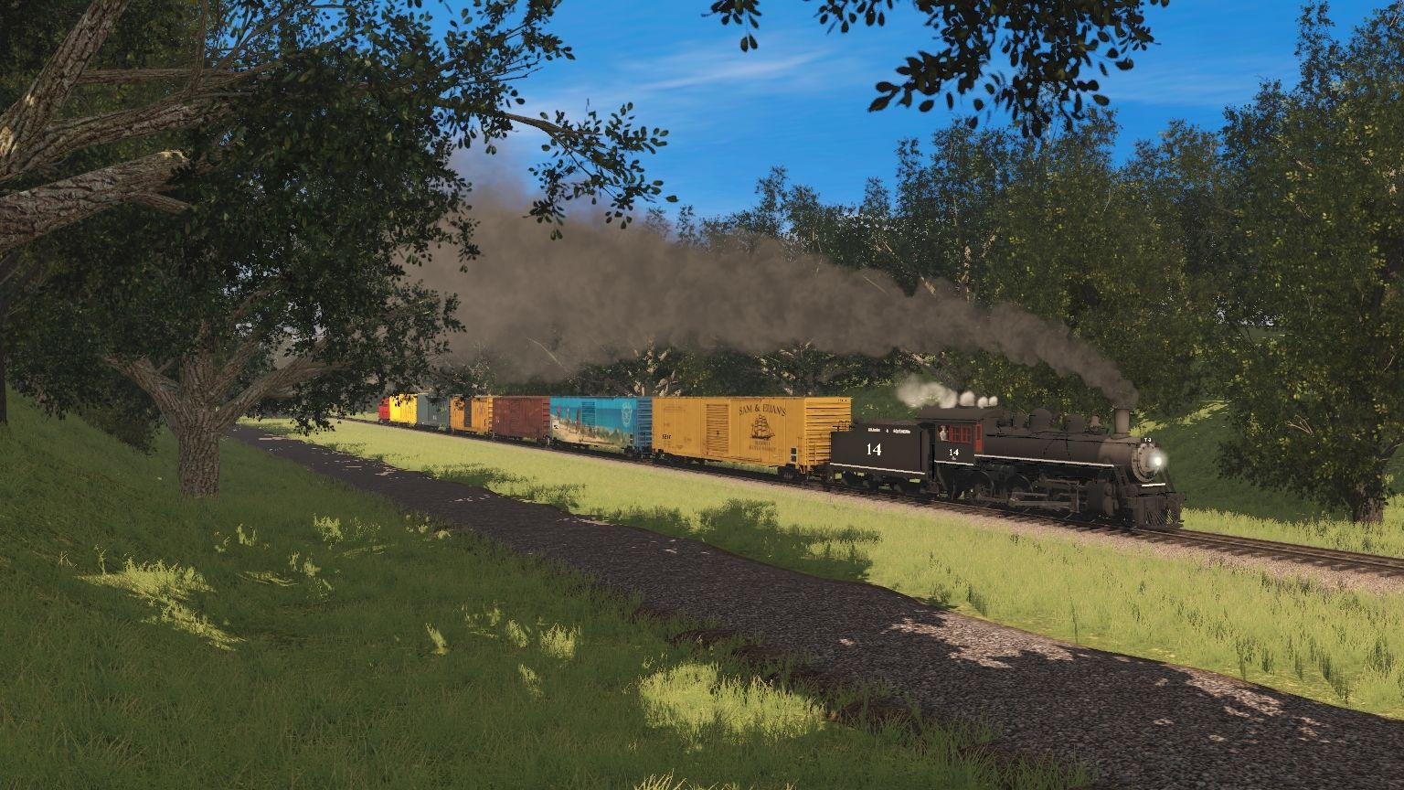 Tags: Trainz Railroad Simulator 2019, Aragon & Southern, A&S G16a Engine, A&S G16a Tender, Custom 60' ACF Boxcar - Sam & Euan's, Custom 60' ACF Boxcar - San Luis Obispo, EEC (Ex-VAMD) 50ft Boxcar FMC, RBOX 50ft Boxcar FMC, TUME-300583-Centerbeam-WP, TUME-300584-Centerbeam-UP, A&S 1890s Woodside Caboose,