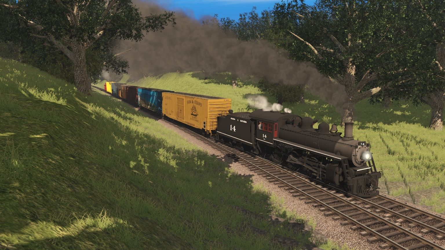 Tags: Trainz Railroad Simulator 2019, Aragon & Southern, A&S G16a Engine, 0-4-0T New Hope Valley 17, A&S G16a Tender, Custom 60' ACF Boxcar - Sam & Euan's, Custom 60' ACF Boxcar - San Luis Obispo, EEC (Ex-VAMD) 50ft Boxcar FMC, RBOX 50ft Boxcar FMC, TUME-300583-Centerbeam-WP, TUME-300584-Centerbeam-UP, A&S 1890s Woodside Caboose,