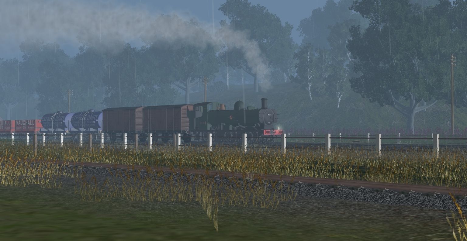 Tags: Trainz: A New Era, Dearnby & District Revised v2.2 (bus+steel) 1.0, Dearnby & District Revised v2.2 (bus+steel) 1.0 - Default, AA BR 57XX 0-6-0PT 9647 BR7A, BR 12T Standard Van, RCH 14t Milk Tanker Express Dairys, RCH 1907 7 Plank Vauxhall #317, RCH 14T Class B Tanker (Shell-BP), RCH 1923 5 Plank Tarslag #818, BR Freight CAR Brake Bauxite