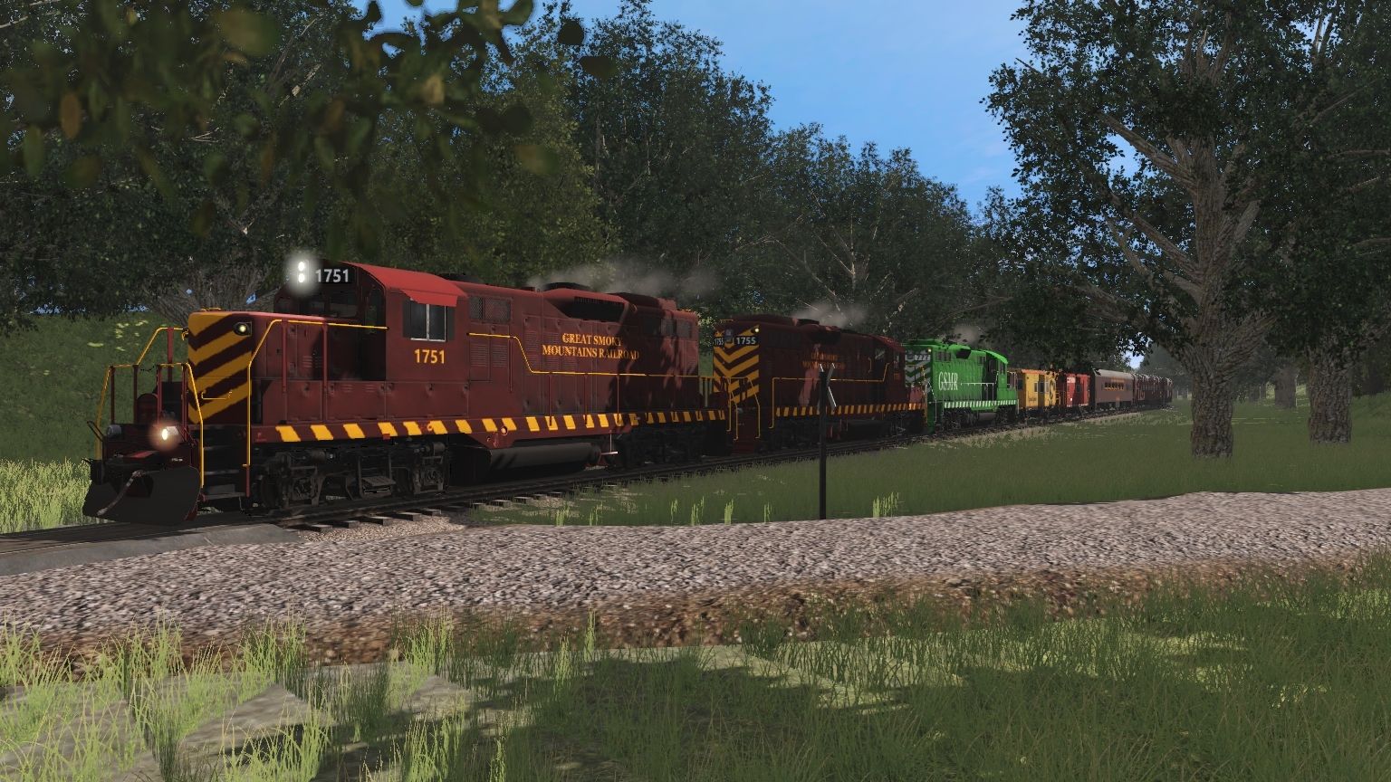 Tags: Trainz Railroad Simulator 2019, Aragon & Southern, GSMR 1751 GP9 chop nose, GSMR 1755 GP9 chop nose, GSMR 777 GP9 chop nose, GSMR S160 2023 #1702 Engine, GSMR Chessie System Bay Window Caboose 1, GSMR SOU Bay Window Caboose Red, GSMR open Coach Lounge, GSMR Coach, GSMR Coach bryson Lightweight V1, GSMR 8507 Diner,