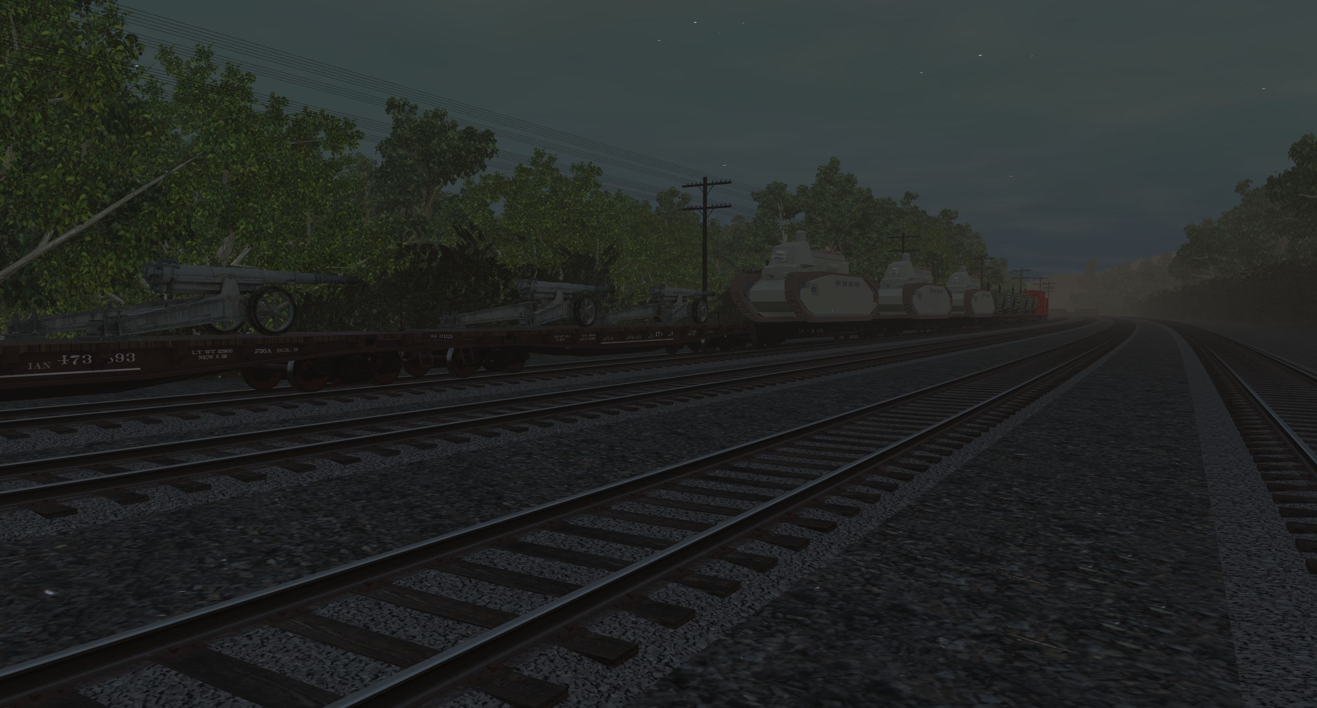 Tags: Trainz Railroad Simulator 2022, Levi & Appalachian V.2, War Train, 50ft flatcar L&A 6 inch Heavy Artillery product load, 70ton AAR Flatcar L&A VFA Iron Fist Tank Product, 50ft flatcar L&A Steam Tank load, 70ton AAR Flatcar L&A 8 inch Heavy Gun product, Caboose-W-L&A_LOD-618537