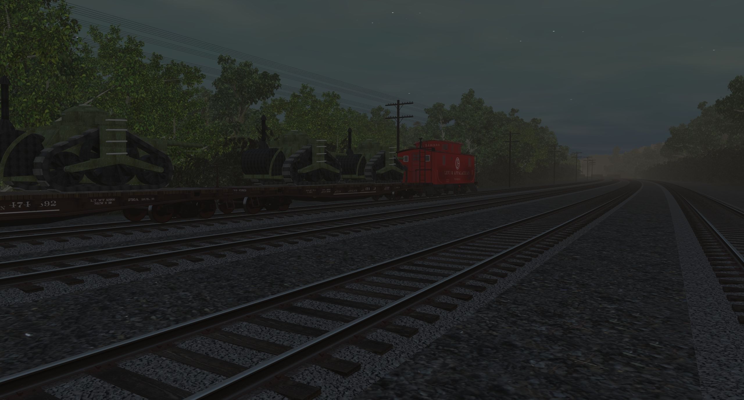 Tags: Trainz Railroad Simulator 2022, Levi & Appalachian V.2, War Train, Caboose-W-L&A_LOD-618537, 70ton AAR Flatcar L&A VFA Iron Fist Tank Product, 50ft flatcar L&A 6 inch Heavy Artillery product load, 50ft flatcar L&A Steam Tank load, 70ton AAR Flatcar L&A 8 inch Heavy Gun product