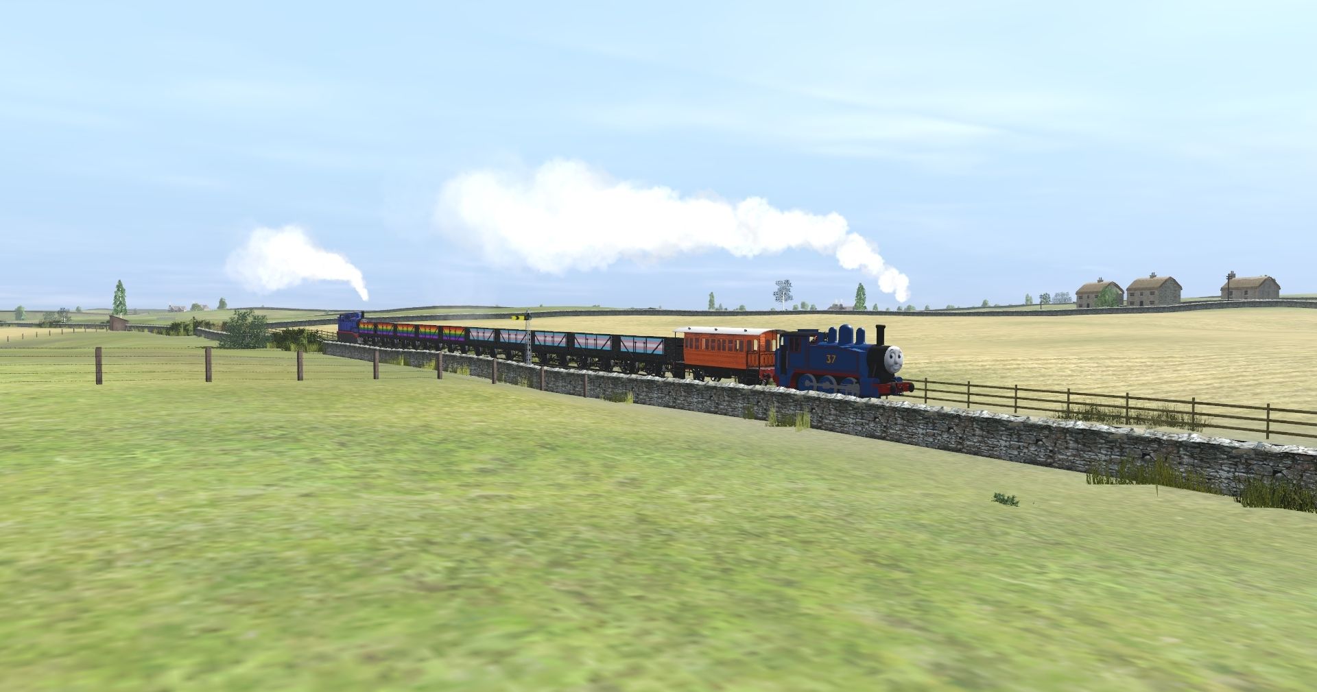 Tags: Trainz Railroad Simulator 2019, 6 Gangstas Release, Default, MR #37 - Renn the Tank Engine, handfulmacaroni - GNC Thomas, MR #56 - Millie the Tender Engine, Flying Cam PBR, MR #132 - Cadin the Express Engine, TTTE - Henrietta, Engie's - TVS 7 Plank Wagon (Classic TS19), MR #56 - Millie's Tender, Old Bogey Coach - 1st, MR #132 - Cadin's Tender, Old Bogey Coach - 3rd
