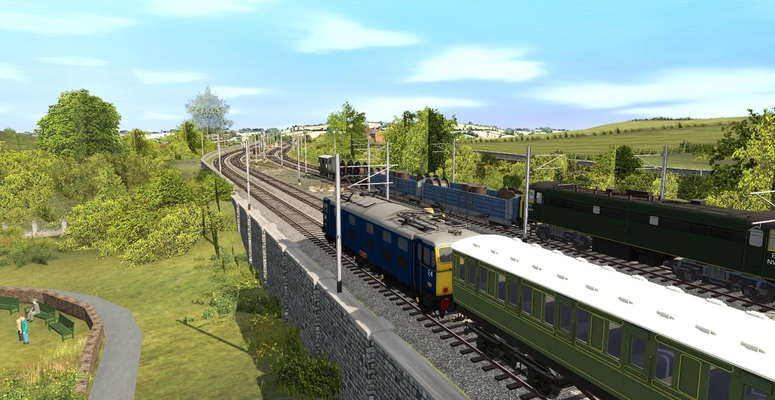 Tags: Trainz Railroad Simulator 2019, Hit Era - Peel Godred Station (Electrified), Mushy - E4 'Abbey' the PGB Electric, PGB Steve, Engie's - TVS Tan Bogie Coach (1st & 2nd W/Faces) (TS19), Engie's - TVS Tan Bogie Coach (3rd Composite W/Faces) (TS19), Engie's - TVS Tan Bogie Coach (3rd Brake) (TS19), Engie's - TVS L&B 8T Open Wagon (TS19), NWR Low Loader Wagon, NWR Wagon Brakevan L&Y 10 Ton