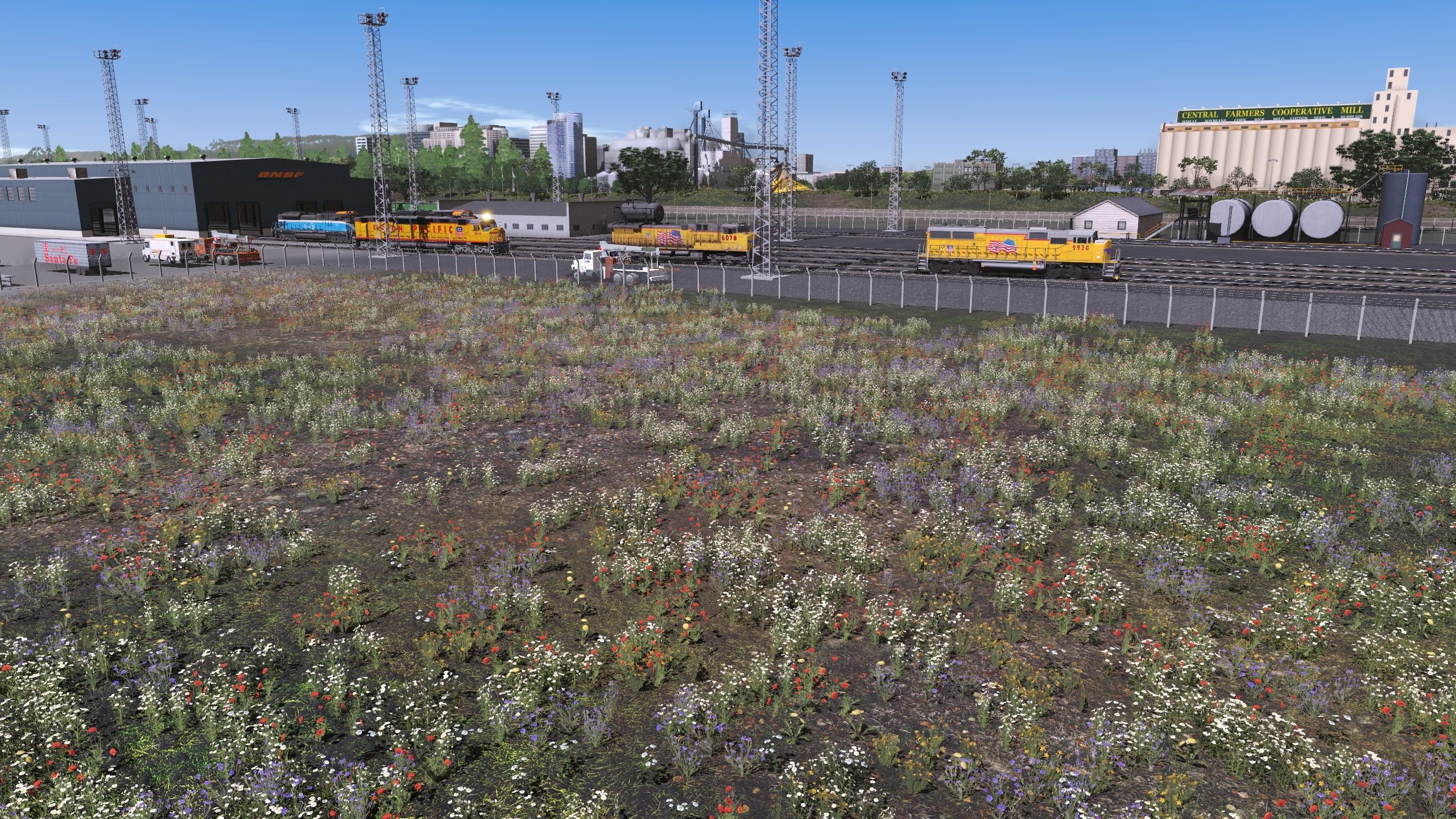 Caption: Railyards with flower covered grounds