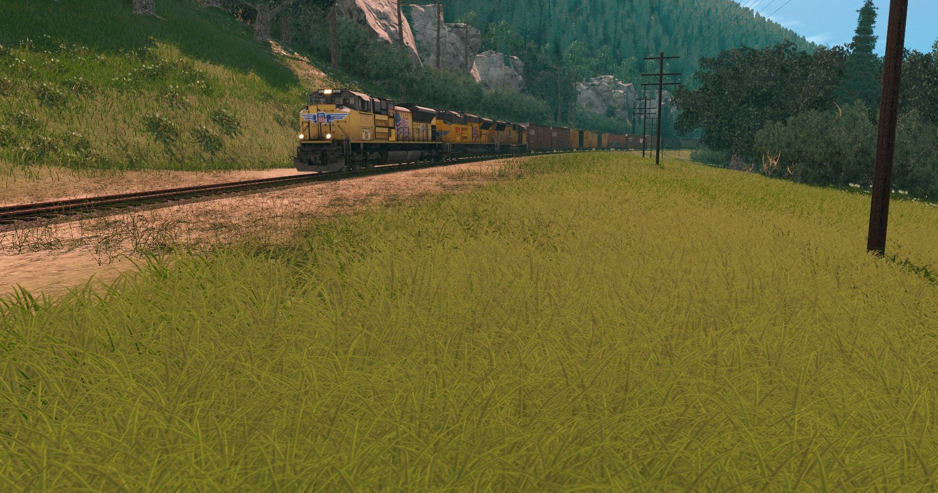 Tags: Trainz Railroad Simulator 2019, USA Route - Far Northern Mountains, Default, UP SD70ACe NON-ISO 2a Late, UP SD70ACe-T4 3000d, UP SD70M Flared Radiator, 60ft HC Boxcar NS Ver2, 60ft HC Boxcar TTX Ver2, 60ft HC Boxcar UP, WP 60ft Boxcar Berwick (Autoparts), WP PC&F 6033, WE LO 178756, WE Evans Covered Hopper #178640, WCCL 50ft Boxcar FMC