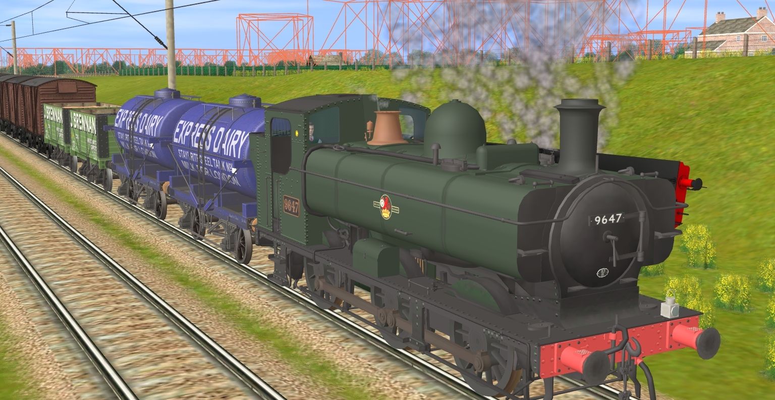 Tags: Trainz: A New Era, Project UK v0.29 WIPe, Project UK v0.29 WIPe - Default, AA BR 57XX 0-6-0PT 9647 BR7A, LBSCR I3 32091 BR Lined Black Modified Cab, RCH 14t Milk Tanker Express Dairys, RCH 1923 7 Plank J Brennan, BR 12T Standard Van, BR(W) 20T Toad Brake Van Weathered Unfitted