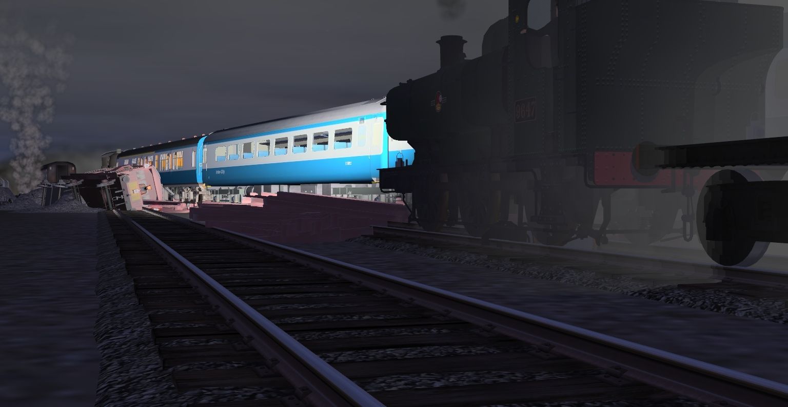 Tags: Trainz: A New Era, Crash Scene, Crash Scene - Default, AA BR 57XX 0-6-0PT 9647 BR7A, BR ex GWR 7200 class, BR Class 37 Green Split Headcode Half Yellow, GWR King Edward II, BR Standard Class 4/1-BR Lined Black Double Chimney, BR 57xx class, Stanier 8F 2-8-0 BR Black, BR V class Schools, BR wagon CAR olive/yellow, BR Blue/Grey MK2f TSO, RCH 1907 7 Plank Vauxhall #317