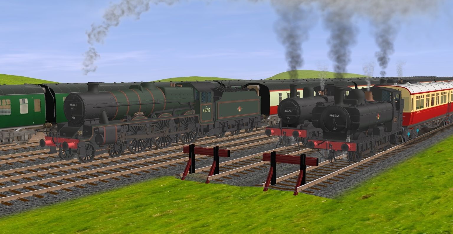 Tags: Trainz: A New Era, Eastnox & Westford Railway V2 WIP, Viaduct Test, AA 45719 Glorious BR10AZ, AA BR 57XX 0-6-0PT 9682 BR4A, AA 45516 The Bedfordshire & Hertfordshire Rgt. BR10AZ, AA 47606 3F 0-6-0T BR4A, AA 42700 5P4F 2-6-0 BR1A, BR Autocoach Blood And Custard, AA Fowler 3500G BR10AZ, BR Mk1 BFK Carmine, AA Fowler 3500G BR1A, Bogie Bolster Crank Wagon, BR(W) 20T Toad Brake Van Weathered Unfitted