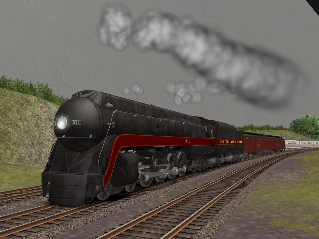 Tags: Trainz: A New Era, Brazemore Yard, N&W Class J 611 (Spirit Of Roanoke), N&W Class J 611 tender, N&W Pullman Baggag car, Southern Budd Coach, Southern Budd Dining Car, PRR FOM POS21A Observation
