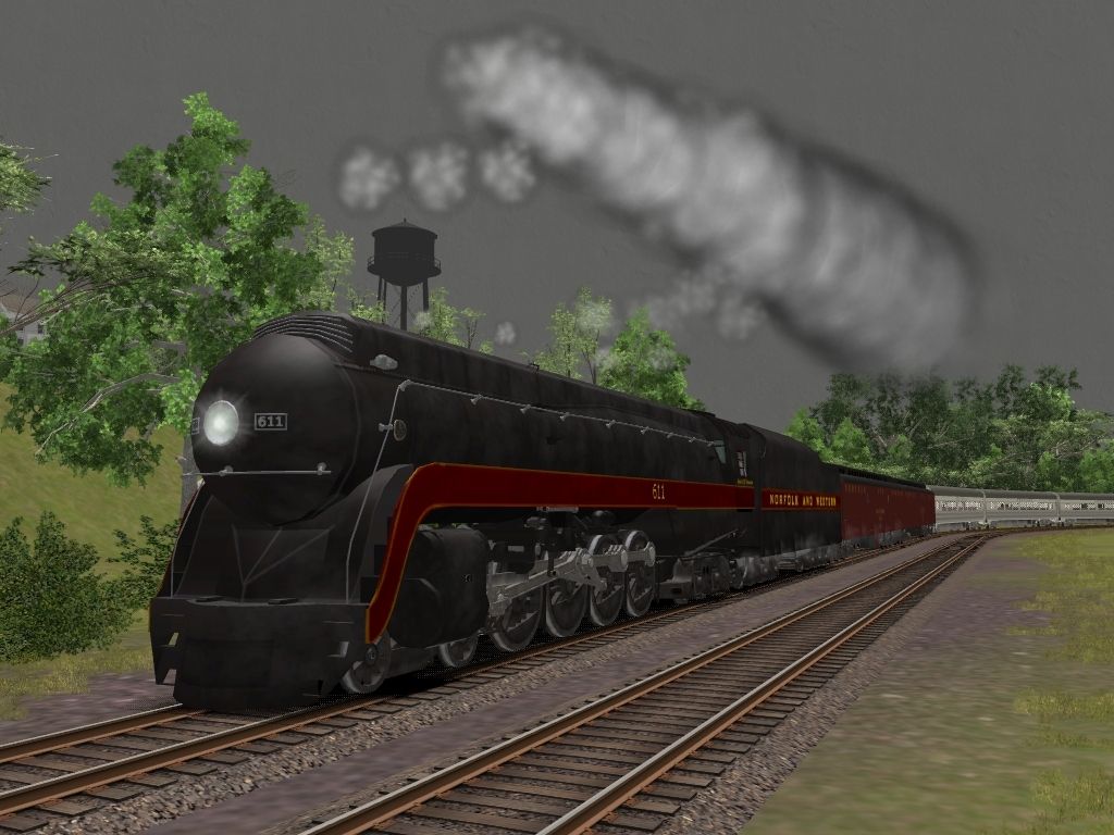 Tags: Trainz: A New Era, Brazemore Yard, N&W Class J 611 (Spirit Of Roanoke), N&W Class J 611 tender, N&W Pullman Baggag car, Southern Budd Coach, Southern Budd Dining Car, PRR FOM POS21A Observation