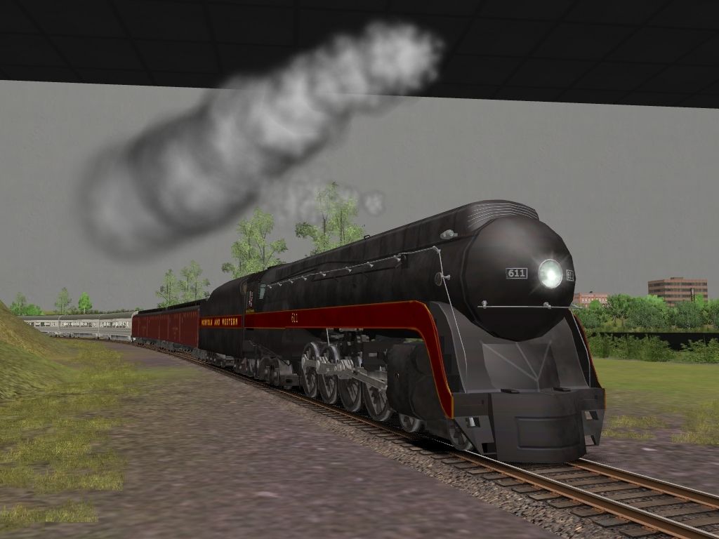 Tags: Trainz: A New Era, Brazemore Yard, N&W Class J 611 (Spirit Of Roanoke), N&W Class J 611 tender, N&W Pullman Baggag car, Southern Budd Coach, Southern Budd Dining Car, PRR FOM POS21A Observation