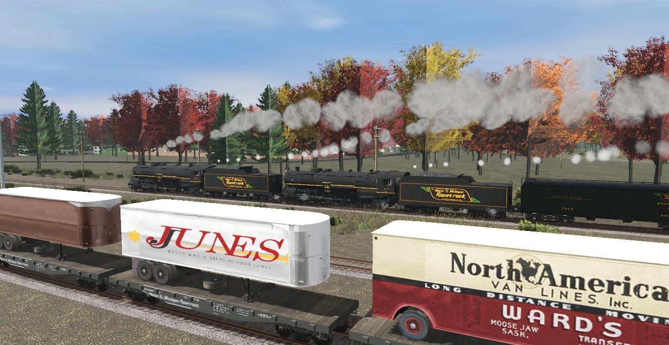 Tags: Trainz Railroad Simulator 2019, New England Coastal Steam Era, Railfanning the M&MRT, Maine & Michigan Racetrack M-2 4-8-2 'Mountain, Maine & Michigan Racetrack ALCo FA-1, Maine & Michigan Racetrack EMD GP7 #2200, Maine & Michigan Racetrack EMD GP7 #2208, Maine & Michigan Racetrack E-2 2-8-2 'Mikado, TUME-300597-Trailer-Flatcar-UP, TUME-300594-Trailer-Flatcar-UP, Maine & Michigan Racetrack R50b express refrigerator, REA (Ex-Troop) Express Boxcar #8255, Maine & Michigan Racetrack F30-a flat car, Maine & Michigan Racetrack M-2 4-8-2 'Mountain' Tender