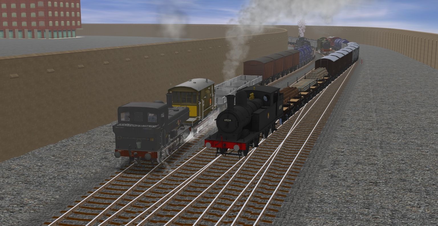 Tags: Trainz: A New Era, Eastnox & Westford Railway V2 WIP, Bolston Yard Test, BR ex GWR 1366 class, LNER N5 69254, BR ex GWR 56xx class lined, BR Dukedog 3200 class, AA BR 57XX 0-6-0PT 9647 BR7A, BR wagon CAR olive/yellow, BR ex GWR 3 Plank wagon, LBSCR Wagon Single Bolster Southern, LBSCR Wagon Van Southern Late, BR 12 ton Ventilated Van 4 detailed 3.5m, RCH 1923 5 Plank BR Period 01