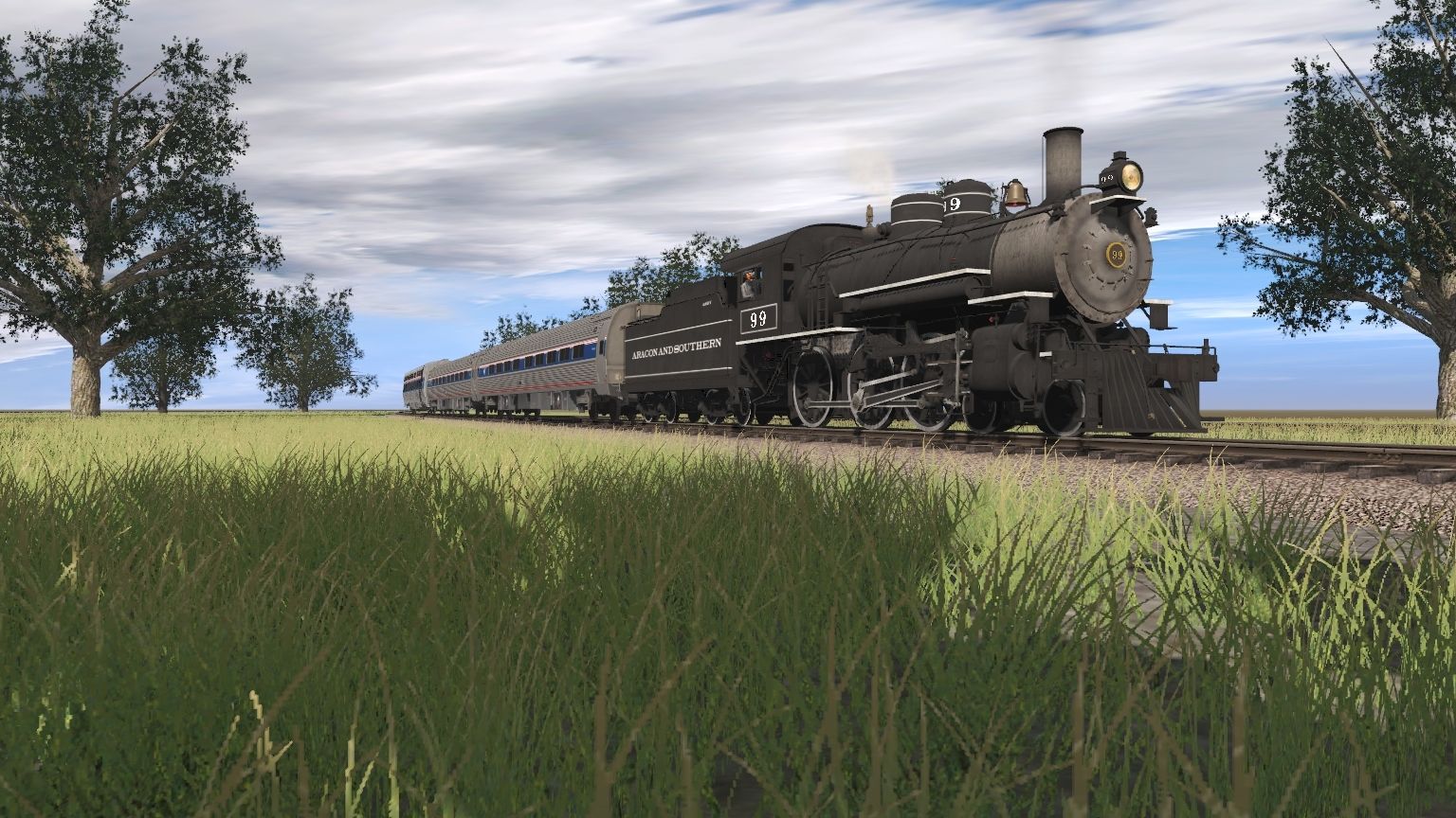 Tags: Trainz Railroad Simulator 2019, Aragon & Southern, A&S 4-6-0 Engine, CSX SD70MAC YN3b FR, CSX ES44AH YN3TL, KCS SD70ACe NON-ISO 2a Grey Ghost, A&S 4-6-0 Tender, Amtrak Phase IVb Amfleet Businessclass, Amtrak Phase IVb Amfleet Coachclass, Amtrak Viewliner Sleeper Phase IVb, AP53 Wellcar FEC Weathered, AP53 Wellcar FEC, 53ft Pacer Wellcar (Single)