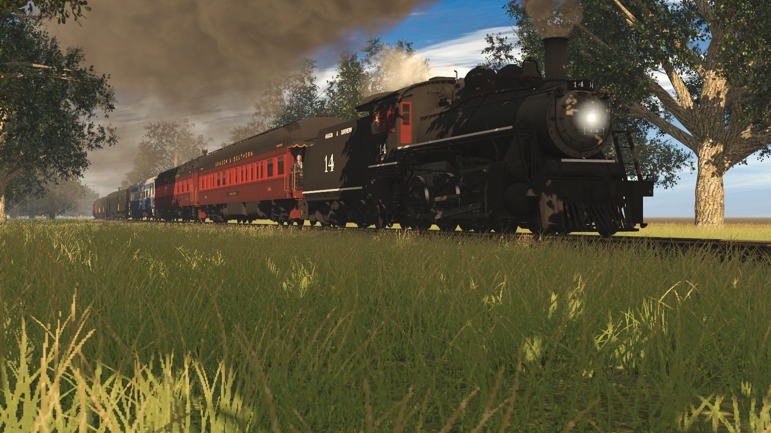 Tags: Trainz Railroad Simulator 2019, Aragon & Southern, A&S G16a Engine, CSX GP38-2 Blue Stripe (Early), CSX C40-8W 7812 Spirit of America, A&S G16a Tender, A&S Excursion Observation, A&S Excursion Diner, A&S Sophie Diner, FCSR Combine, FCSR Coach V4, FCSR Coach V3, FCSR Coach V1
