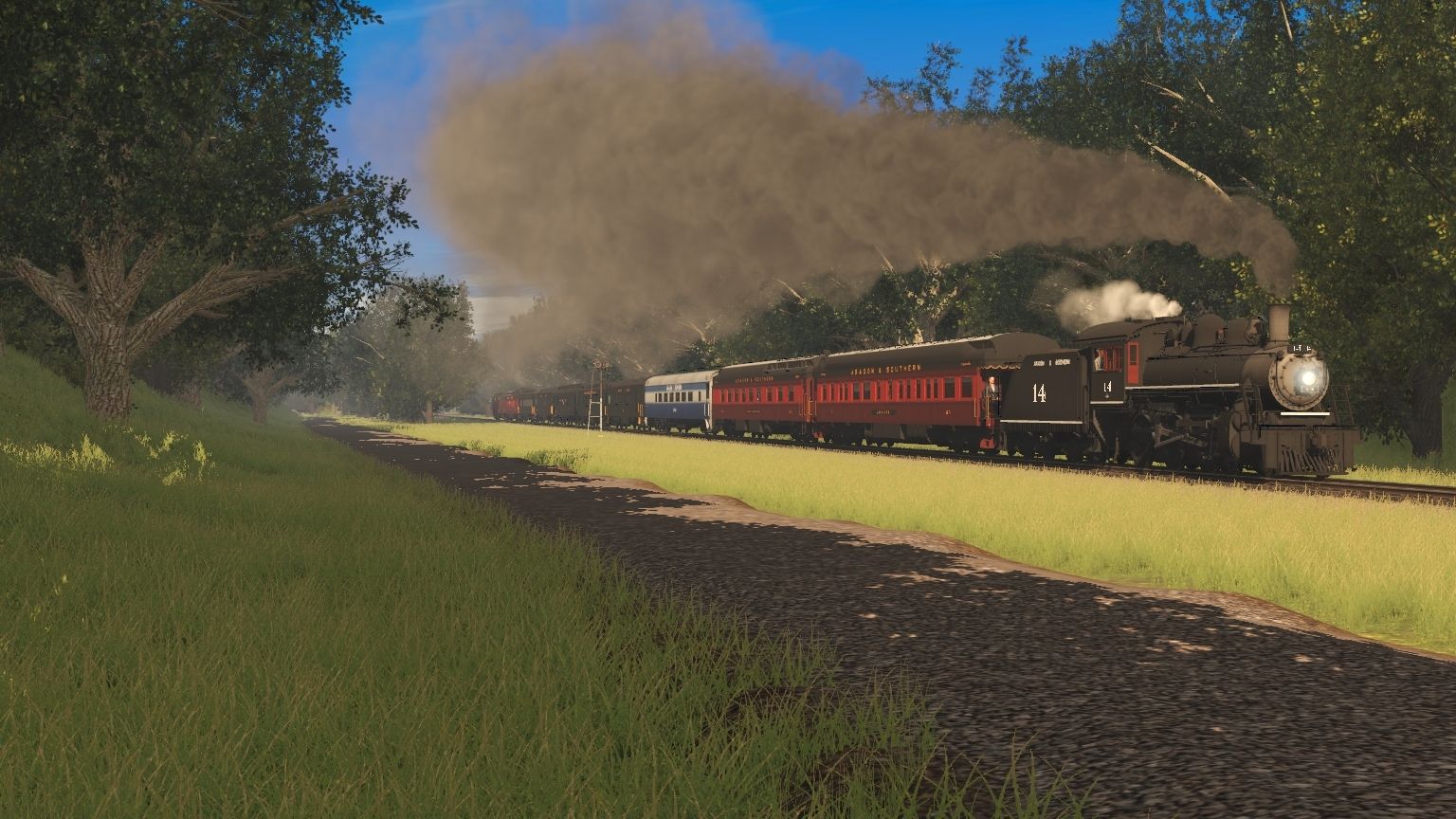 Tags: Trainz Railroad Simulator 2019, Aragon & Southern, A&S G16a Engine, A&S G16a Tender, A&S Excursion Observation, A&S Excursion Diner, A&S Sophie Diner, FCSR Combine, FCSR Coach V4, FCSR Coach V3, FCSR Coach V1, FCSR Coach V2, A&S Excursion Generator