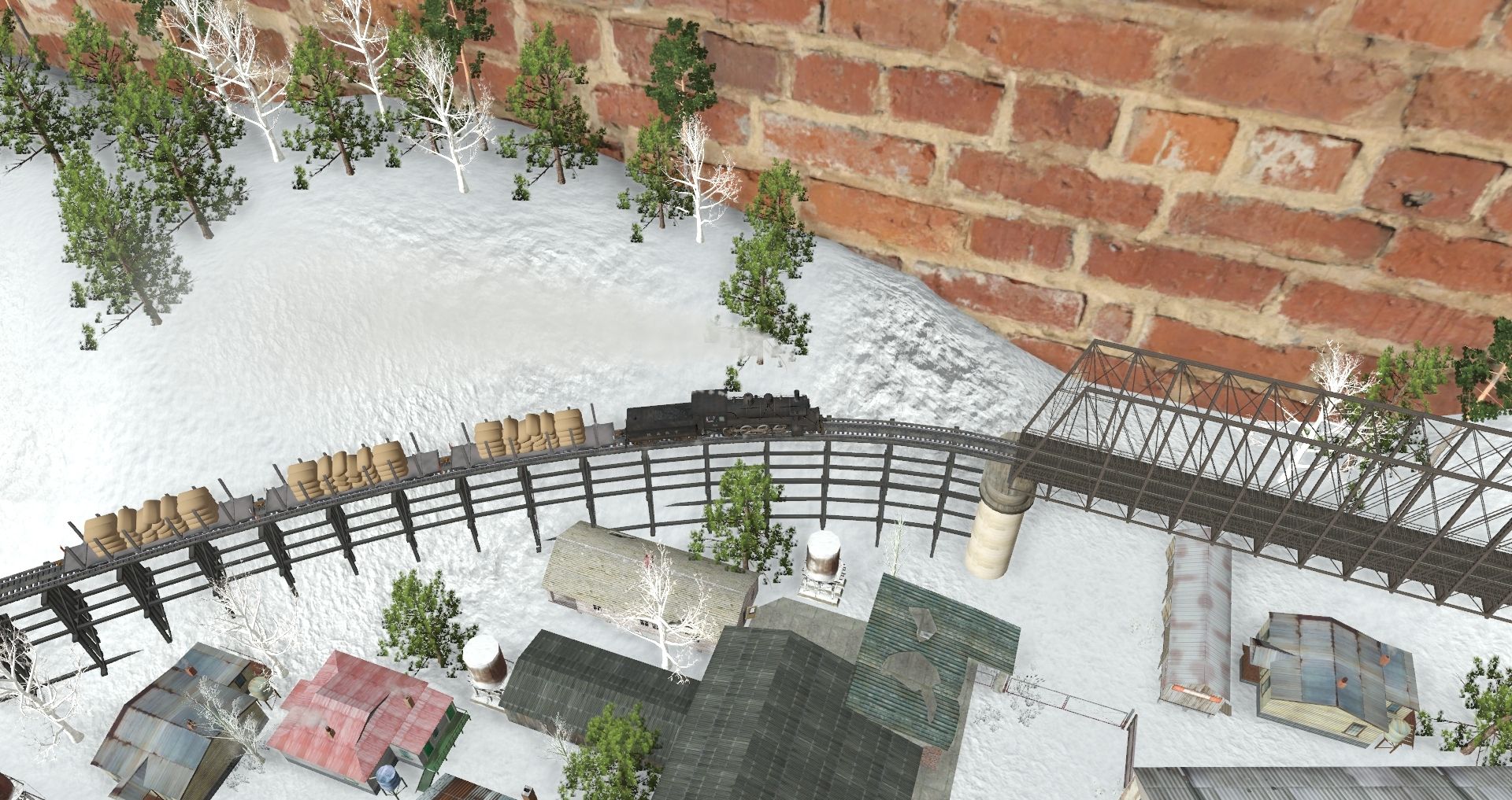 Tags: Trainz Railroad Simulator 2019, TRS19 - The Cilie Oldphartz SG Logging Railroad - Model Trainz Layout, TRS19 - The Cilie Oldphartz SG Logging - Session 2 - Winter, Loco Baldwin medium 2-8-0H HP, Custom 40' Boxcar - #5, Loco Baldwin medium 2-8-0H Tender, Flatcar Depressed Center 55 ft UP DES, Logs 50ft Clinch, Custom 40' Boxcar - #2, Custom 40' Boxcar - #1, SP C50-9 Caboose, Barge Float Empty, 40ft Stockcar Union Pacific 48155D Ant, 50ft up flatcar