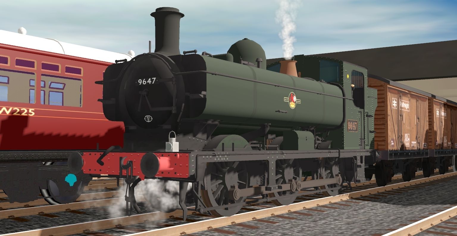 Tags: Trainz Railroad Simulator 2019, Eastnox to Westford Railway [Work In Progress}, Eastnox to Westford Railway [Work In Progress} - Default, AA BR 57XX 0-6-0PT 9600 BR2A, AA BR 57XX 0-6-0PT 9647 BR7A, AA BR 57XX 0-6-0PT 9682 BR4A, AA 47606 3F 0-6-0T BR4A, Stanier 8F 2-8-0 BR Black, Autocoach - BR Maroon, RCH 14T Milk Tanker (Express Dairy), BR VEA brown van, Stanier 4000 Gal Tender BR, NCB 7 plank wagon 1 broken, RCH 14T Class B Tanker (Shell-BP)