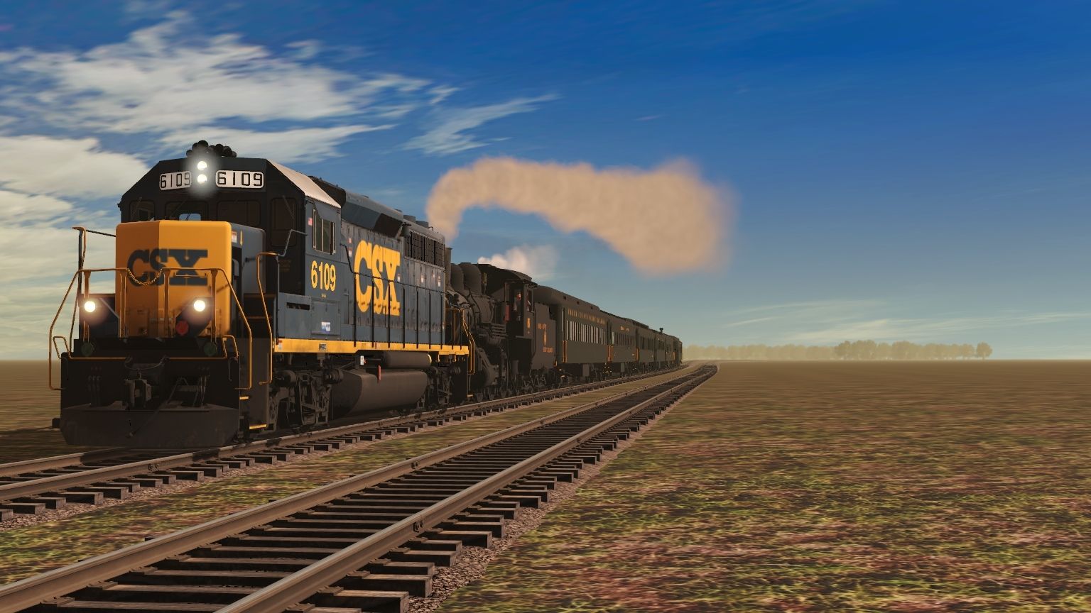 Tags: Trainz Railroad Simulator 2019, Aragon & Southern, Main Session, CSX GP40-2 YN3, FCSR 85 Engine, FCSR 85 Tender, FCSR Coach V2, FCSR Coach V1, FCSR Coach V3, FCSR Coach V4, FCSR Combine, FCSR Open Air Gondola, FCSR Observation Summit View