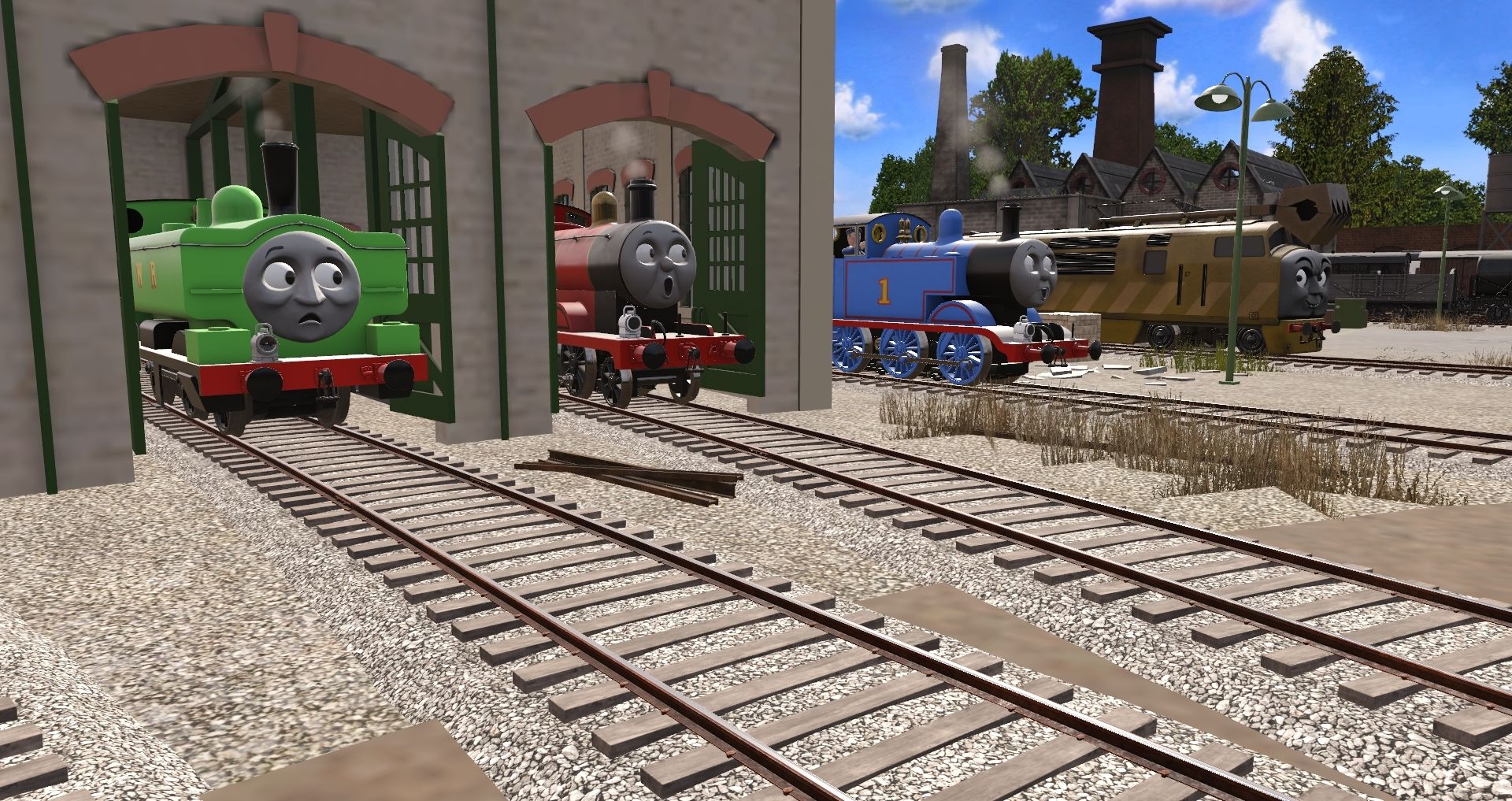 Tags: Trainz Railroad Simulator 2019, TATMR - Tidmouth Sheds, Flying Cam PBR, TTTE - Duck (TATMR Livery), TSI - James the Red Engine, TSI - Thomas the Tank Engine, TSI - James' Tender, TTTE - Diesel 10, Engie's - TVS L&B 4T Open Wagon (TS19), Engie's - TVS GWR Cattle Van (TS19), Engie's - TVS LNER 12T Van (S2 - S8 TS19), TSI - Sodor Works Unit Coach (TRS19), Engie's - TVS SR CCT 4 Wheeled Van (TS19)