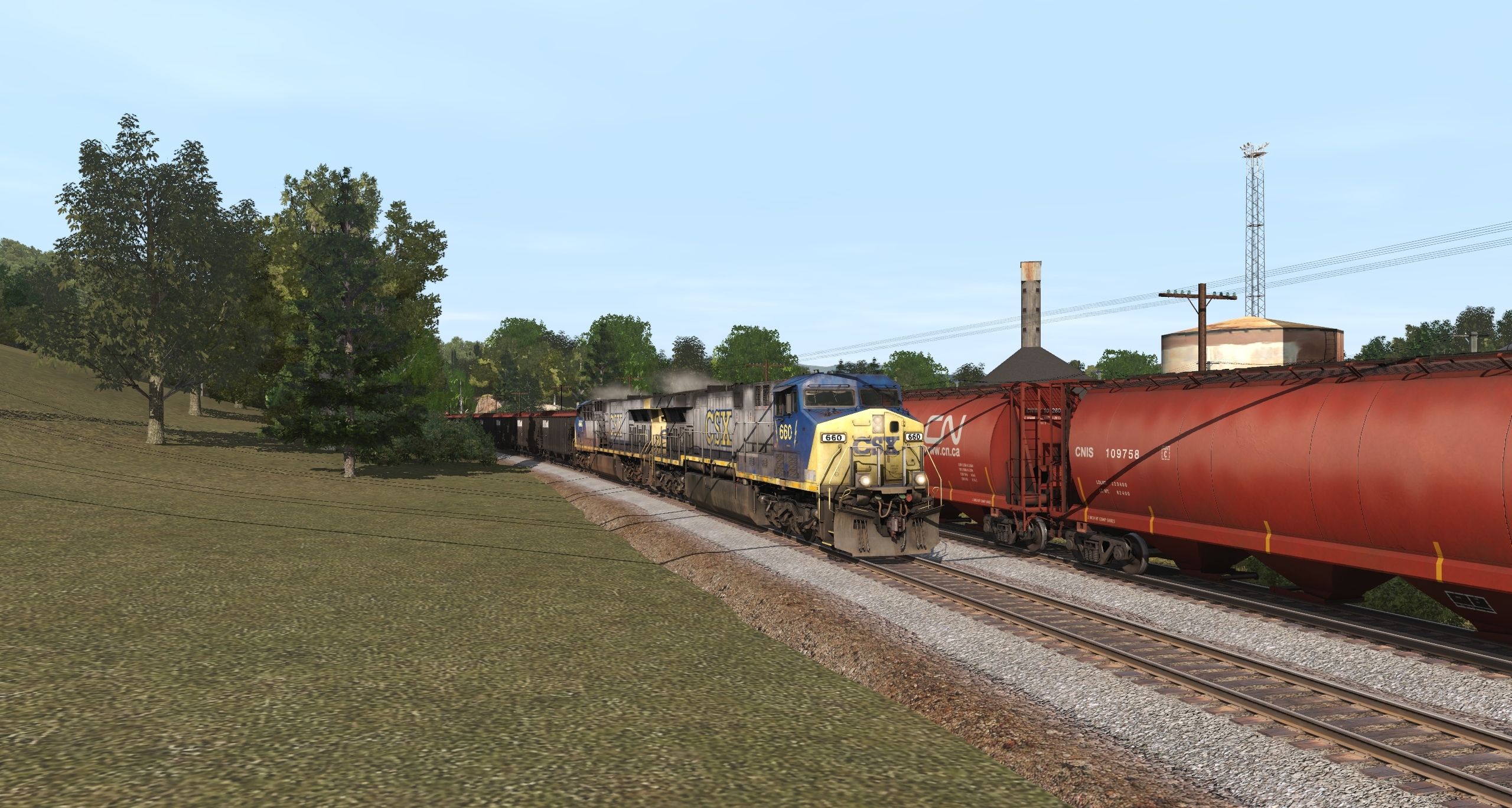 Tags: Trainz Railroad Simulator 2019, Datsun Junction, Default, CSX AC6000CW YN2 654-699 3, CSX AC6000CW YN2 654-699 2, CN ES44DC, CN C44-9W 2523-2602, CNWX Cylindrical Hopper, CITX Bethgon, NS 100 Ton Hopper