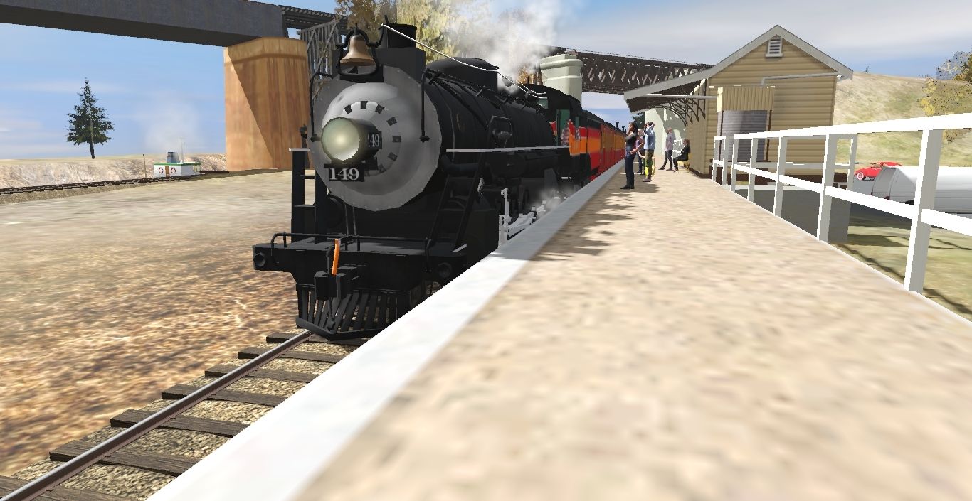 Tags: Trainz Railroad Simulator 2019, Devil's Gulch & Helengon, Default, Southern Pacific Narrow Gauge 4-8-4 #149 'Daylight, G&D #14 Doodlebug(S), SP GS-4 Engine Daylight, GP35 Texas & Rio Grande Western #280, GP35 Texas & Rio Grande Western #282, Southern Pacific Narrow Gauge 4-8-4 #149 'Daylight' Tender, Southern Pacific Narrow Gauge Boxcar 1, Southern Pacific Narrow Gauge Boxcar 2, Southern Pacific Narrow Gauge Baggage Car 'Daylight, Southern Pacific Narrow Gauge Coach 'Daylight, Southern Pacific Narrow Gauge Parlor Car 'Daylight