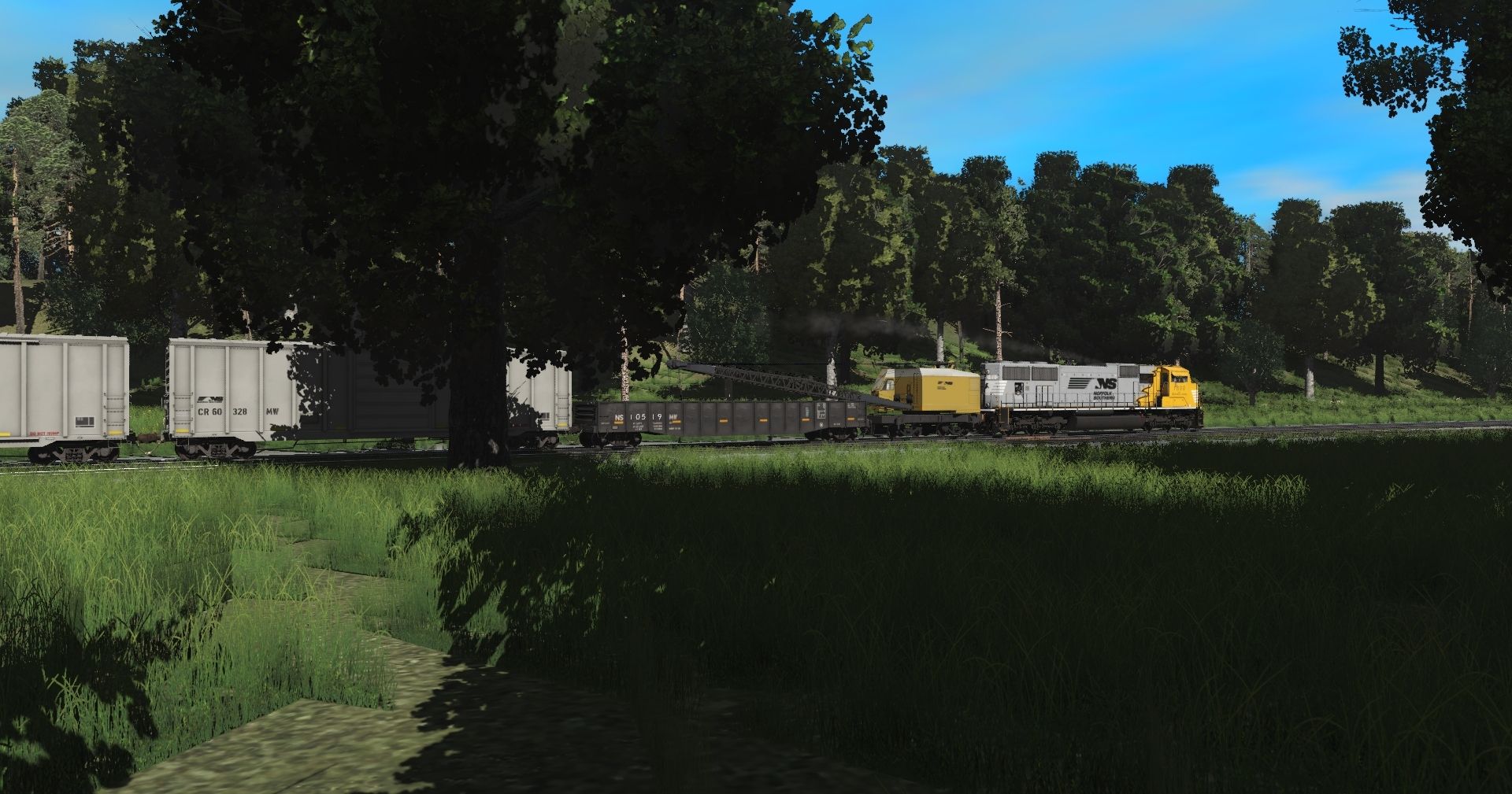 Tags: Trainz Railroad Simulator 2022, Norfolk Southern Birmingham East End, Default, NS SD70ACC #1800, NS MOW P-S 50_6ft Boxcar 60325 ETR, NS MOW P-S 50_6ft Boxcar 60328 ETR, NS MOW P-S 50_6ft Boxcar 60323 ETR, NS MOW Ballast Hopper 100 Ton ETR, NS MOW KDE Crane 992184 ETR, NS G72 Gondola, NS MOW 52ft Greenville Gondola Strip ETR