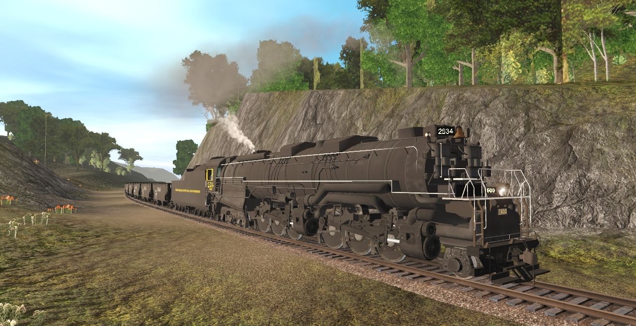 Tags: Trainz Railroad Simulator 2019, CK&W Spruce Mountain branch, early morning empties, CK&W 2-6-6-6 T1, CK&W long tender w/doghouse, B&O 55 Ton Hopper Roman