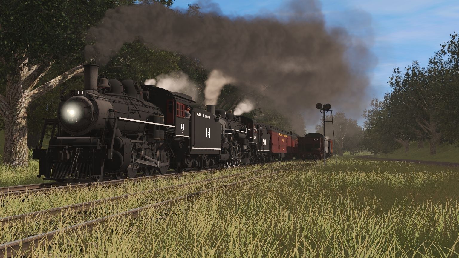 Tags: Trainz Railroad Simulator 2019, Aragon & Southern, Main Session, A&S G16a Engine, A&S 209 Engine, A&S G16a Tender, A&S 209 Tender, A&S Excursion Tool Car, A&S Ex-PRR H21a Hopper, A&S Excursion Generator, A&S Silver Coach, A&S ADA 1365, A&S Small Aux Tender, A&S Aux Tender