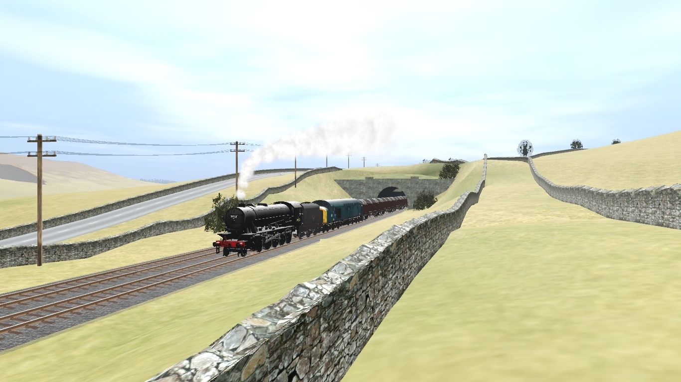 Tags: Trainz Railroad Simulator 2019, Hawes Junction, BR Ex-WD 2-10-0, BR Class 40 40162 blue, BR Black 5 Tender, BR BLA Coil Carrier Railfreight loaded, BR ex LMS Ventilated Van, BR Freight CAR Brake Bauxite