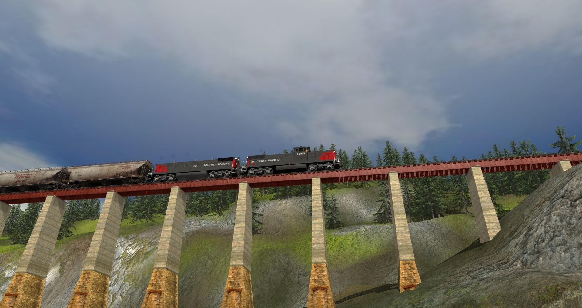 Tags: Trainz: A New Era, Kickstarter County, Southern Pacific HS18a #1280, Southern Pacific HS18b #1251, Custom ACF 3 Bay - Winchester & Western, Custom ACF 3 Bay - W Farms LLC, Custom C80 - Havenwood Southern, Custom 100 Ton Hopper - MRM, Custom 23000 gal tank - BundleStars, Custom 23000 gal tank - HK Oil, Custom 40' Boxcar - AU Logitistics, Custom 40' Boxcar - a giberiginal Game Store, Custom 40' Boxcar - Grizzled Aussie's Dark Rum