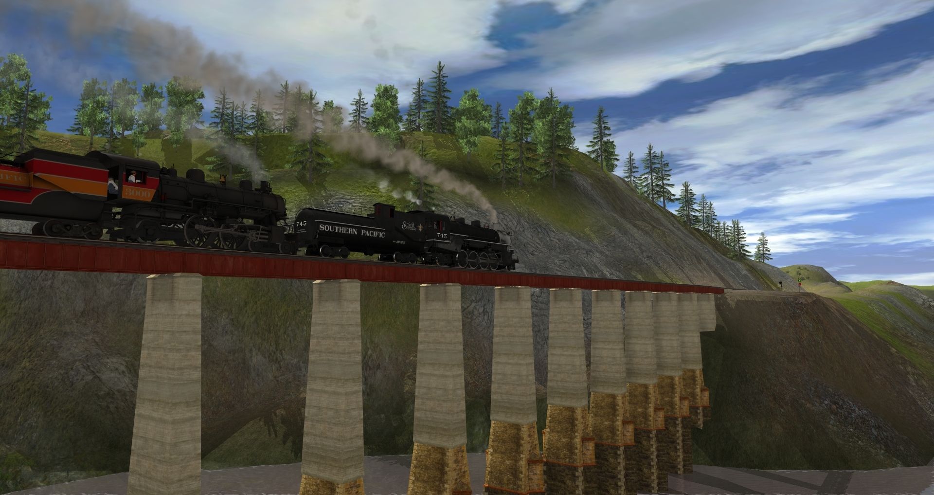 Tags: Trainz: A New Era, Kickstarter County, SP GS-4 Engine Daylight, Southern Pacific A6 Atlantic 3000, SP MK-5 Engine, SP SD40T-2, SAR 406s front section 09, SAR T Class 253 Std Gauge, SAR 406s mid section 09, SAR 406s rear section 09, Loco UP Harriman Consolidation - T:ANE, SAR 500 Class #502, SAR 520 ARHS