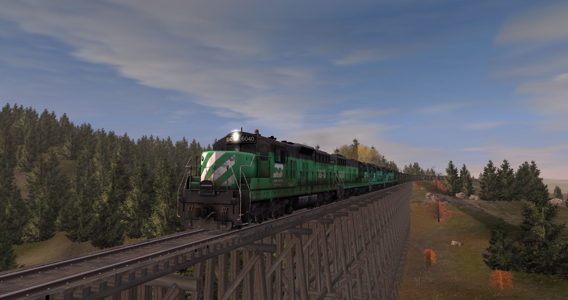 Posted by: sookool | Posted:2017-08-16 02:32:43 Caption: Tags: Trainz: A New Era, Legacy of the Burlington Northern v2, Coal delivery, BN SD7 low hood, BN SD7 high hood, BN 100 Ton Hopper
