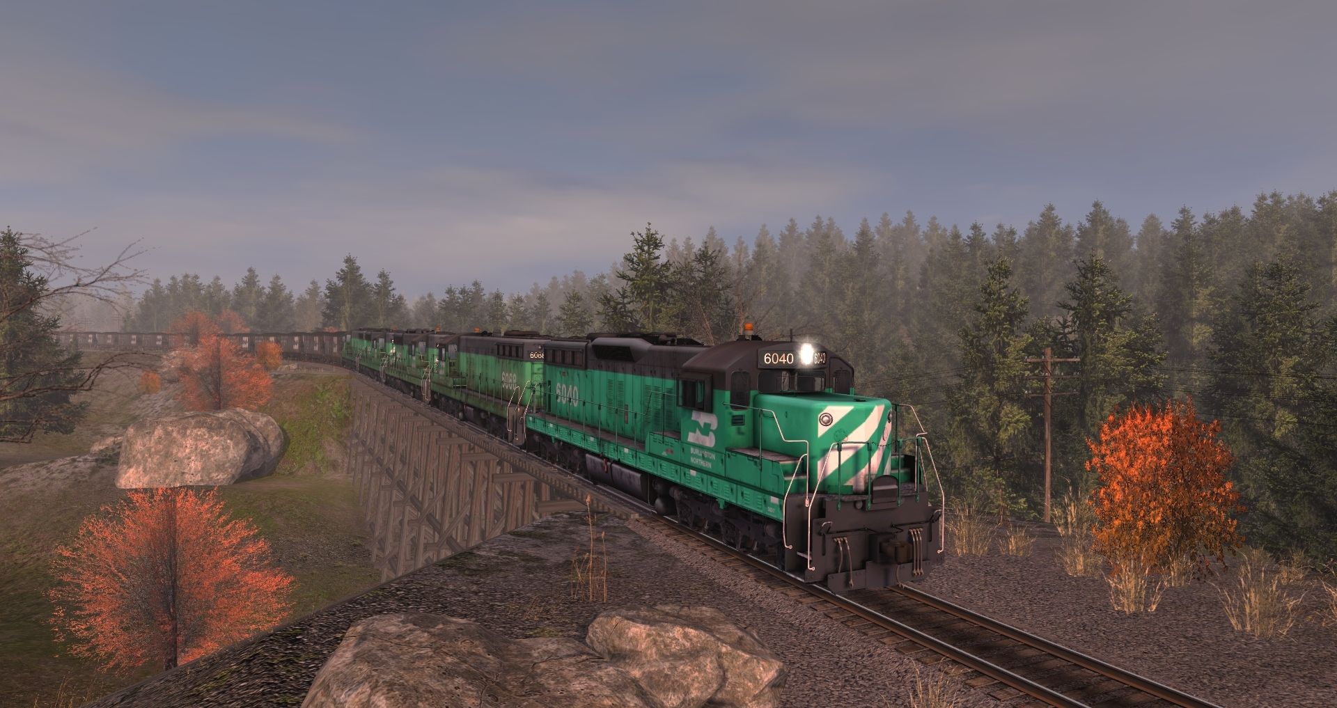 Tags: Trainz: A New Era, Legacy of the Burlington Northern v2, Coal delivery, BN SD7 low hood, BN SD7 high hood, BN 100 Ton Hopper, BN Ce-11 Caboose