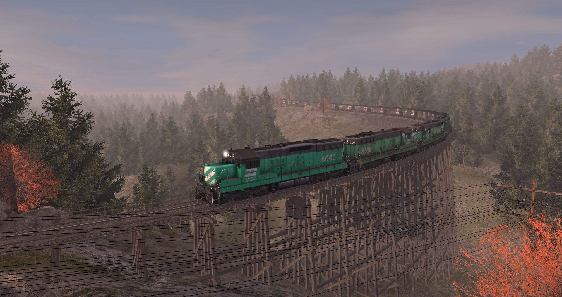 Tags: Trainz: A New Era, Legacy of the Burlington Northern v2, Coal delivery, BN SD7 low hood, BN SD7 high hood, BN 100 Ton Hopper, BN Ce-11 Caboose