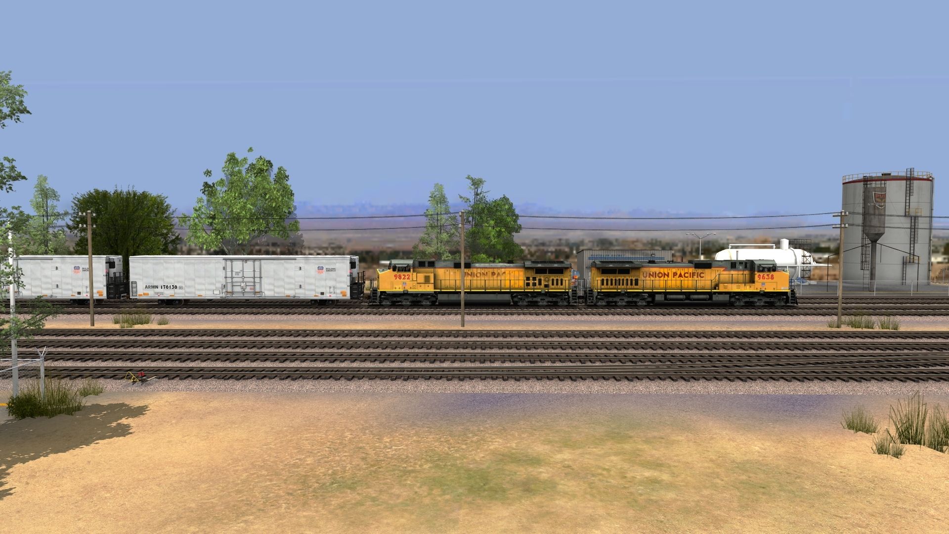 Tags: Trainz: A New Era, Santa Fe Needles District, Salad Shooter 1, UP Dash 9-44CW, UP Dash 9-44CW-Lightning Stripe, ARMN 72ft Mechanical Refrigerator Boxcar