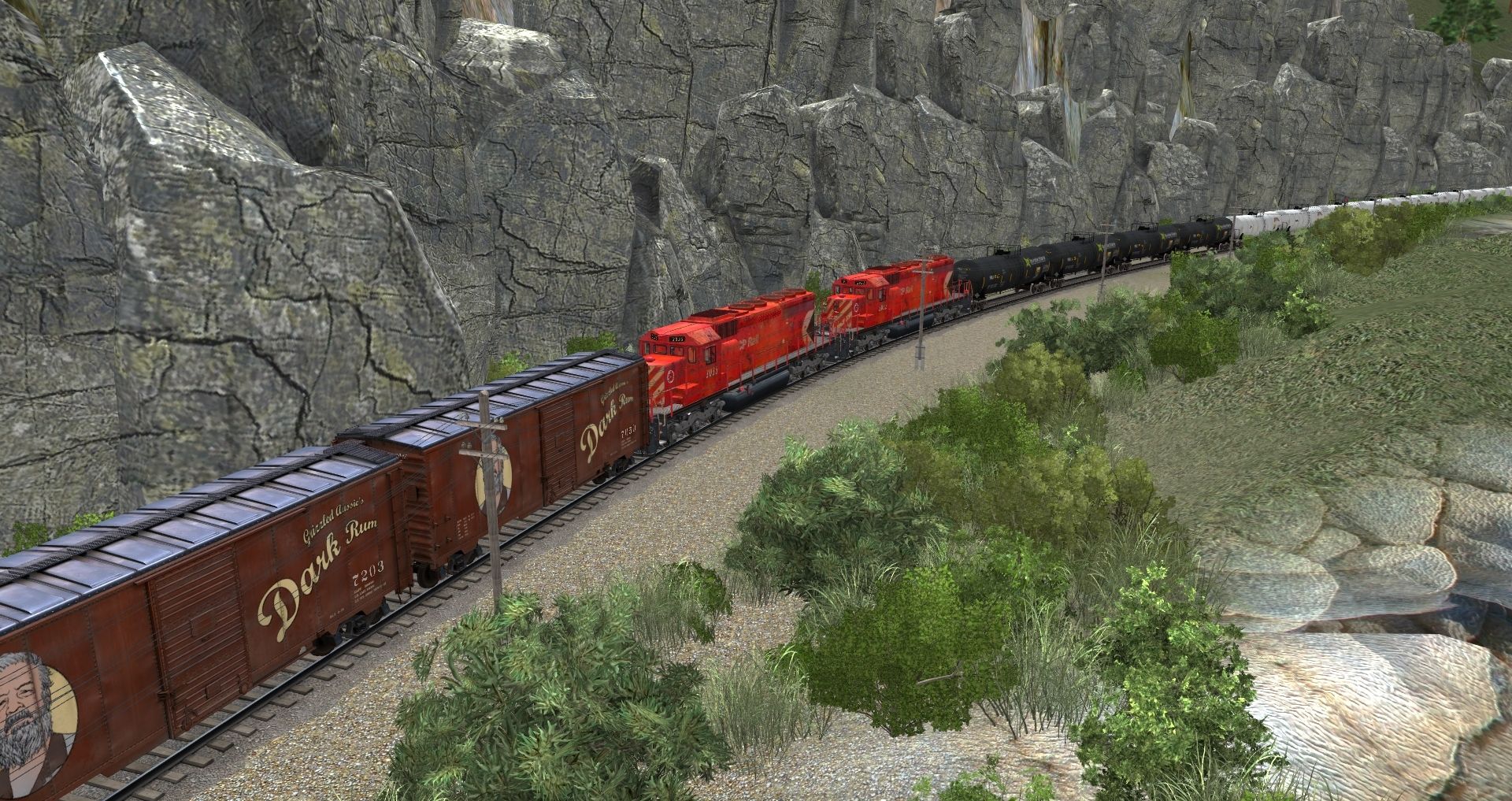Tags: Trainz: A New Era, Canadian Rocky Mountains - Columbia River Basin, CP Rail Freight Run, CP Rail SD40-2 - Weathered, CP Rail SD40-2, Custom 40' Boxcar - Grizzled Aussie's Dark Rum, Custom 40' Boxcar - AU Logitistics, Custom 23000 gal tank - BundleStars, Custom 40' Boxcar - a giberiginal Game Store, Custom 23000 gal tank - HK Oil, Custom 40' Boxcar - HIGGIKAY INDUSTRIES, Hopper Cyl Hawker Siddeley CP Rail Black DES