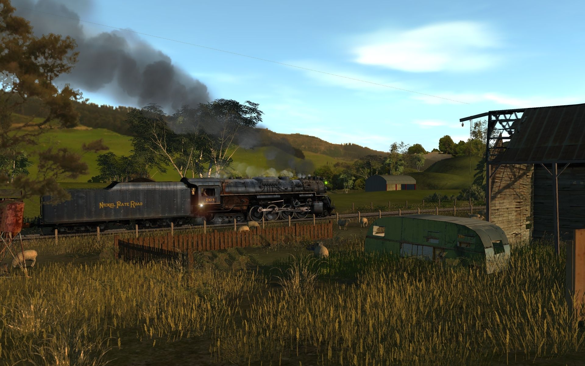 Tags: Trainz: A New Era, Narrow Falls Rail, Narrow Falls Rail session, NKP S-2 Weathered, NZGR Ab class loco, NKP S-2 Tender Weathered, Cattle, NZGR Aa 2nd class coach green, NZGR K class coal Tender