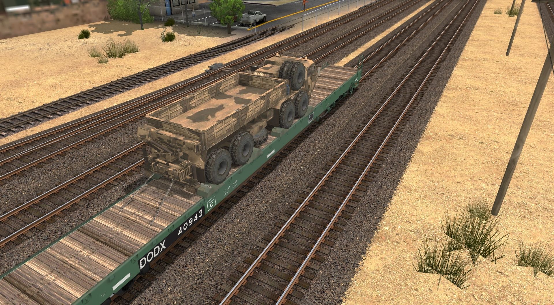 Posted by: Railhead001 | Posted:2017-09-12 07:59:26 Caption: Tags: Trainz: A New Era, Santa Fe Needles inter B, Flatcar 89 ft DODX 6 axle dk GRN wood deck