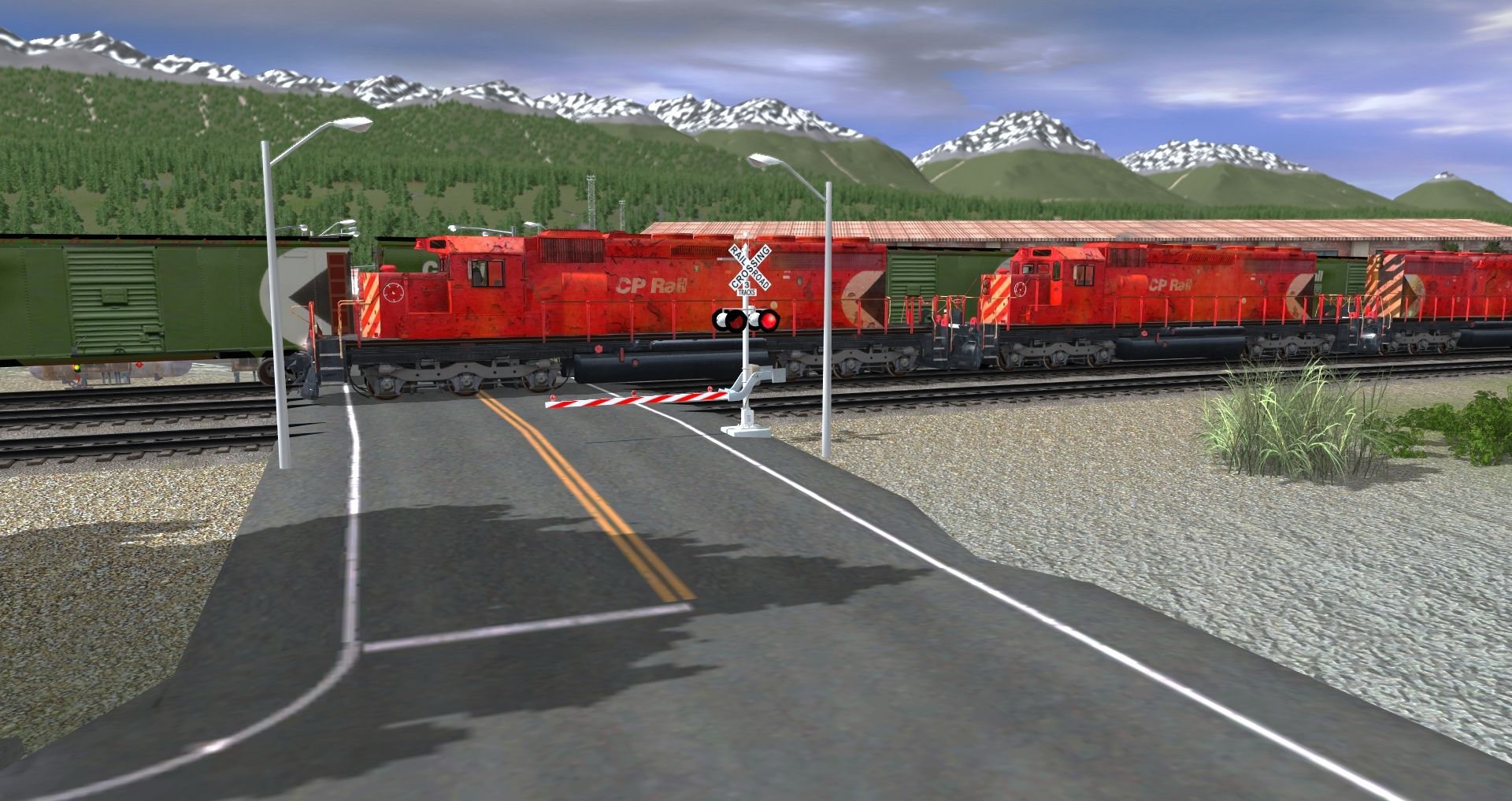 Tags: Trainz: A New Era, Canadian Rocky Mountains - Columbia River Basin, One-Tunnel Automatic Session CRB, CP Rail SD40-2 - Weathered, CP Rail GP9 low hood #1550, Gov of Canada Grain2, Gov. of Alberta Grain1, Gov of Sask. Grain1, CPR Bulk Hopper, CP gondola, CP Container Flat1, CPR 40' Boxcar, CP 52'8'' Bulkhead Flatcar Tolko, CP Rail 52'8'' Bulkhead Flatcar With Center Stakes