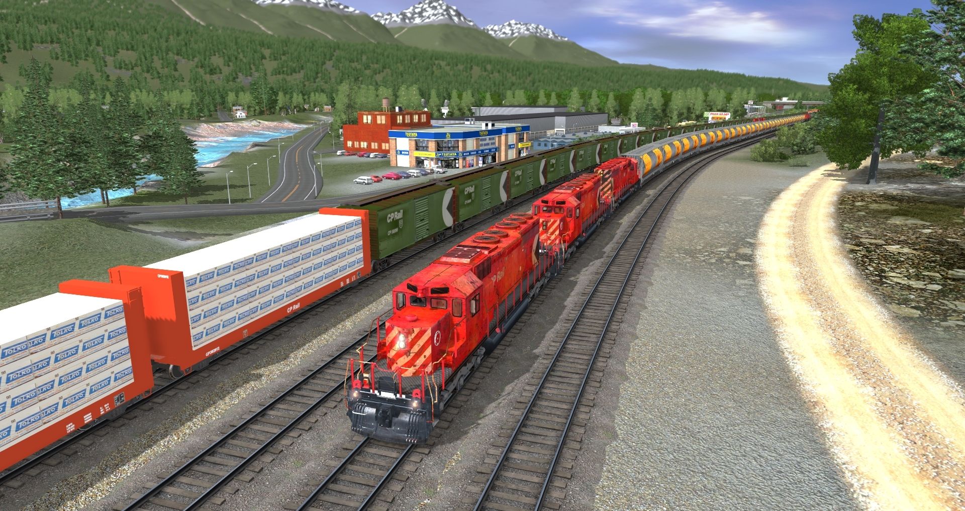 Tags: Trainz: A New Era, Canadian Rocky Mountains - Columbia River Basin, One-Tunnel Automatic Session CRB, CP Rail SD40-2 - Weathered, CP Rail GP9 low hood #1550, Gov of Canada Grain2, Gov. of Alberta Grain1, Gov of Sask. Grain1, CPR Bulk Hopper, CP gondola, CP Container Flat1, CPR 40' Boxcar, CP 52'8'' Bulkhead Flatcar Tolko, CP Rail 52'8'' Bulkhead Flatcar With Center Stakes