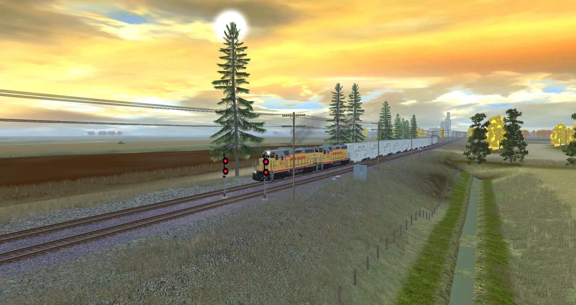Tags: Trainz: A New Era, Fall Harvest - Nebraska, Grain Strain, GP38-2 Union Pacific DES, Union Pacific DD35 A unit #84, Union Pacific DD35 B unit #74b, 2Bay ACF CovHopper Union Pacific 1 #, 2Bay ACF CovHopper Union Pacific 2 #, union pacific piggyback car 1, 54ft Midwestern Grain covered hopper