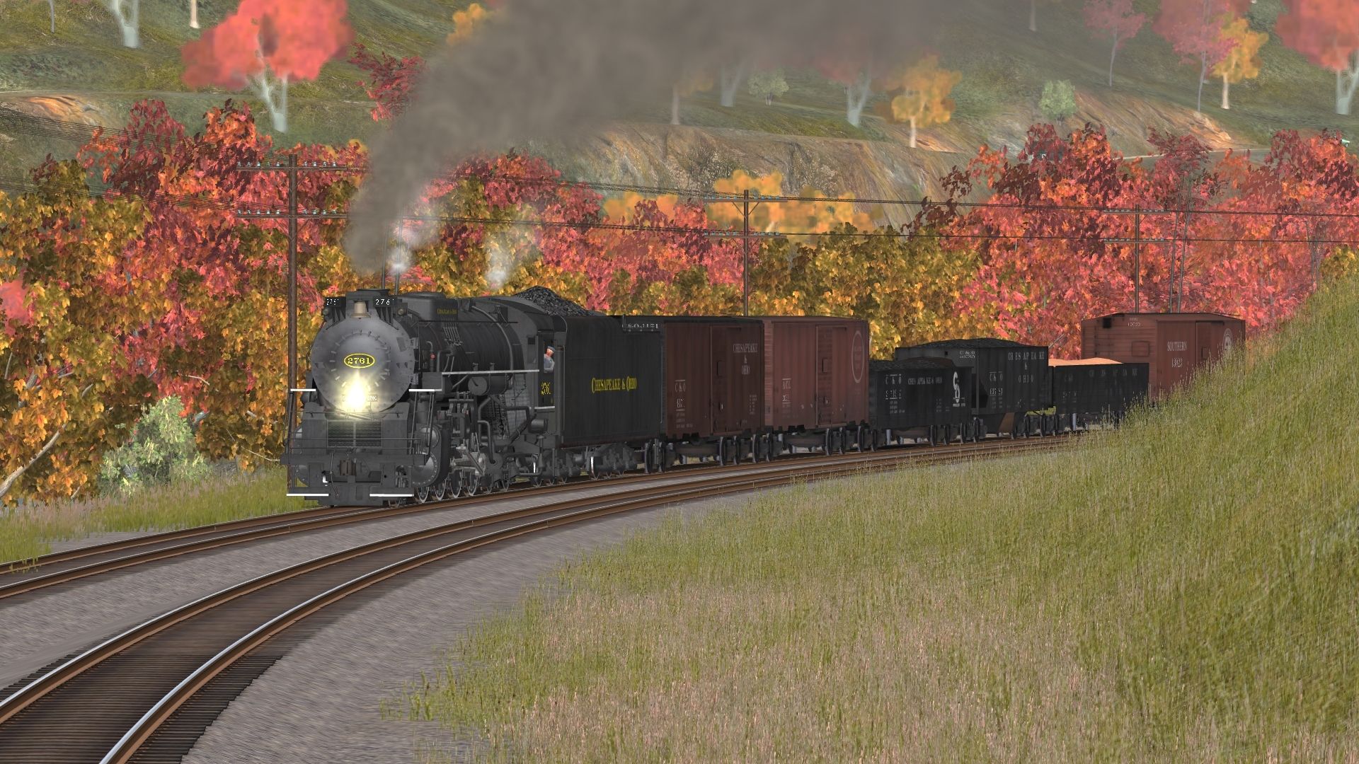 Tags: Trainz: A New Era, C&O Hinton Division, Custom Session, Chesapeake & Ohio G-7s 2-8-0 876, C&O Kanawha Engine, Chesapeake & Ohio G-7s 2-8-0 876 tender, C&O Kanawha Tender, 40ft Boxcar C&O, 40ft Boxcar ACL, C&O Coal Gondola, USRA 55T H C&O, USRA C Gondola C&O, 40ft Boxcar SOU, 70ton AAR Flatcar C&O