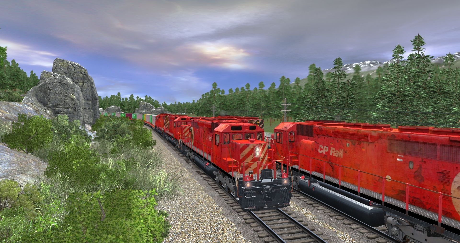Tags: Trainz: A New Era, Canadian Rocky Mountains - Columbia River Basin, One-Tunnel Automatic Session CRB, CP Rail SD40-2 - Weathered, CPR Bulk Hopper, CP Container Flat1