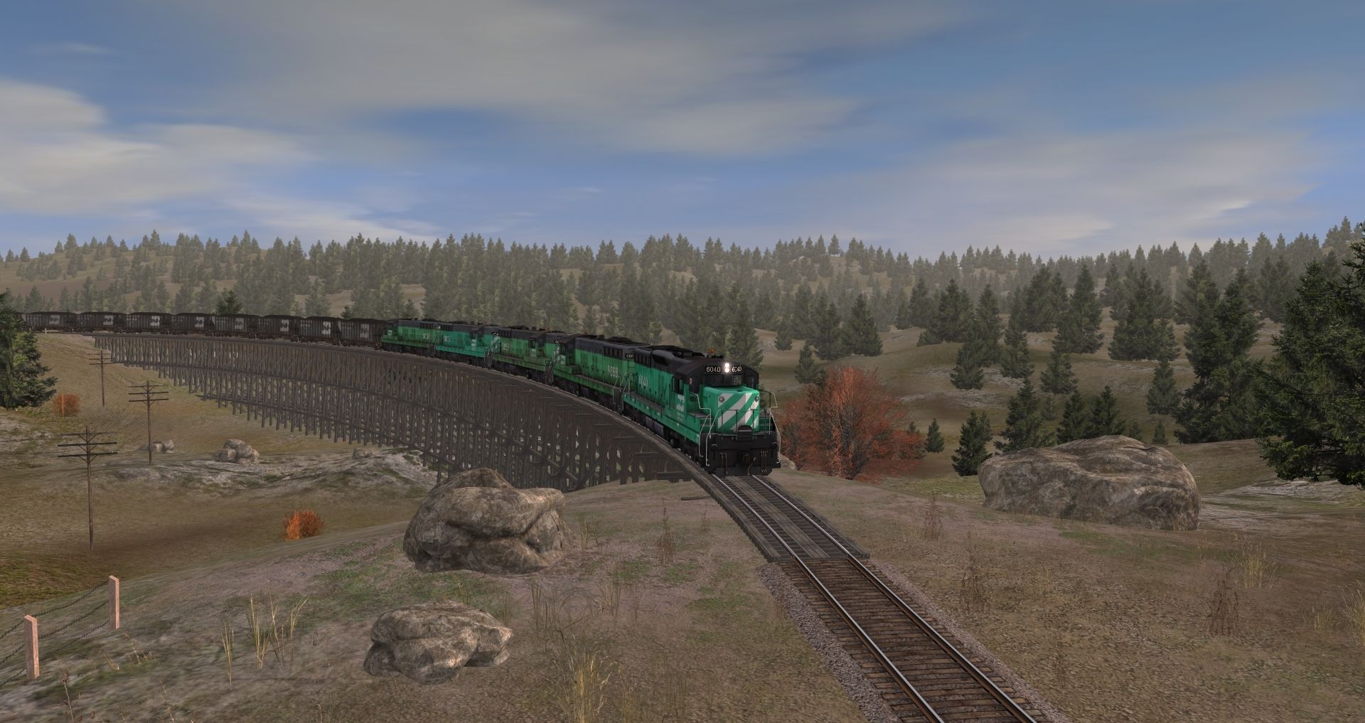 Tags: Trainz: A New Era, Legacy of the Burlington Northern v2, Coal delivery, BN SD7 low hood, BN SD7 high hood, BN 100 Ton Hopper, BN Ce-11 Caboose, Invisible Train, BN ACF Centerflow 3 Bay long hatch
