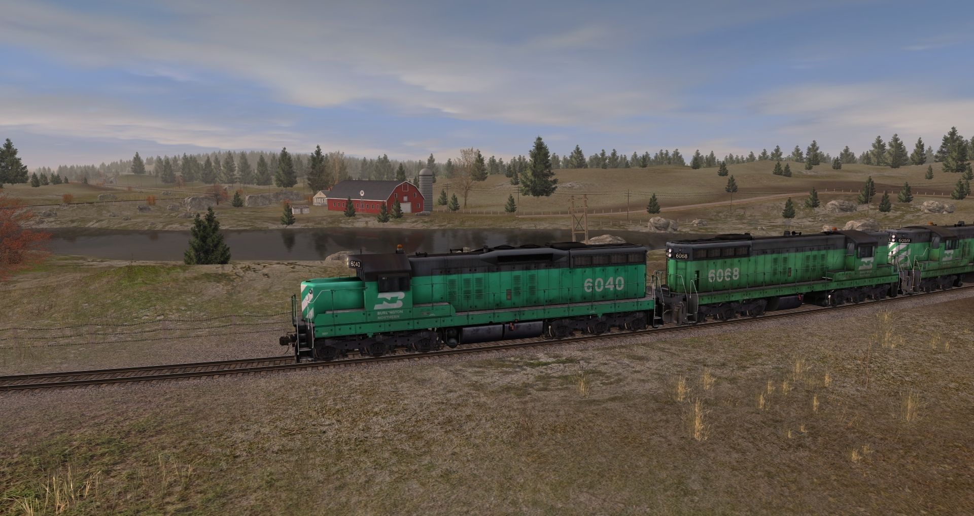 Tags: Trainz: A New Era, Legacy of the Burlington Northern v2, Coal delivery, BN SD7 low hood, BN SD7 high hood, BN 100 Ton Hopper, BN Ce-11 Caboose, Invisible Train, BN ACF Centerflow 3 Bay long hatch