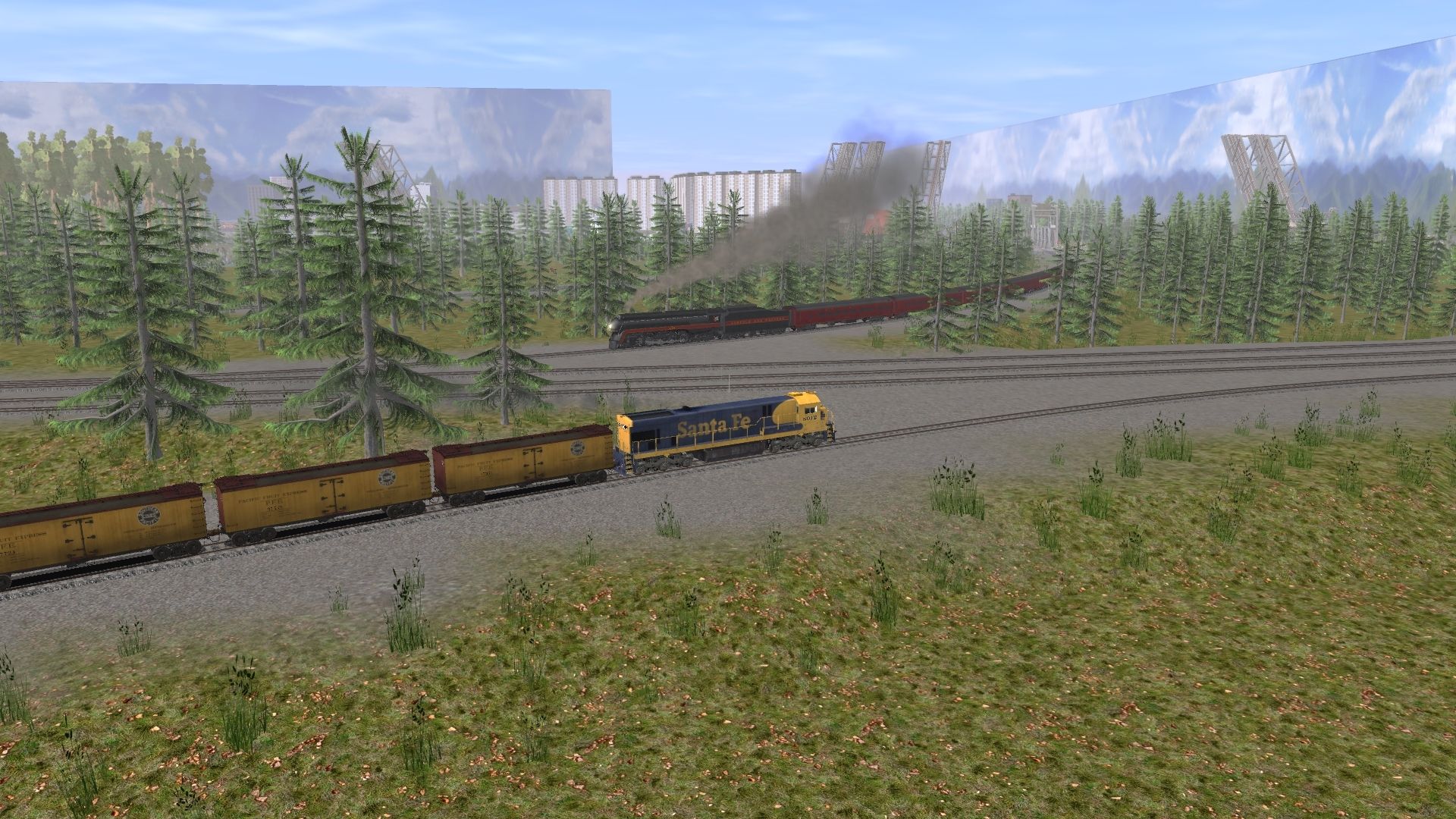 Tags: Trainz: A New Era, Water Route, Bridge Mania, ATSF C30-7, N&W J Class Engine, N&W A Class Engine V2, CP Rail SD40-2 - Weathered, PFE R-40-2 Reefer Early, ATSF Ce-11 Caboose, N&W J Class Tender, N&W NS Powhatan Arrow 01 P1 Locker Car 502, N&W NS Powhatan Arrow 02 P2 Divided Coach 511, N&W NS Powhatan Arrow 03 P3 Standard Coach 535, N&W NS Powhatan Arrow 04 P3 Standard Coach 537