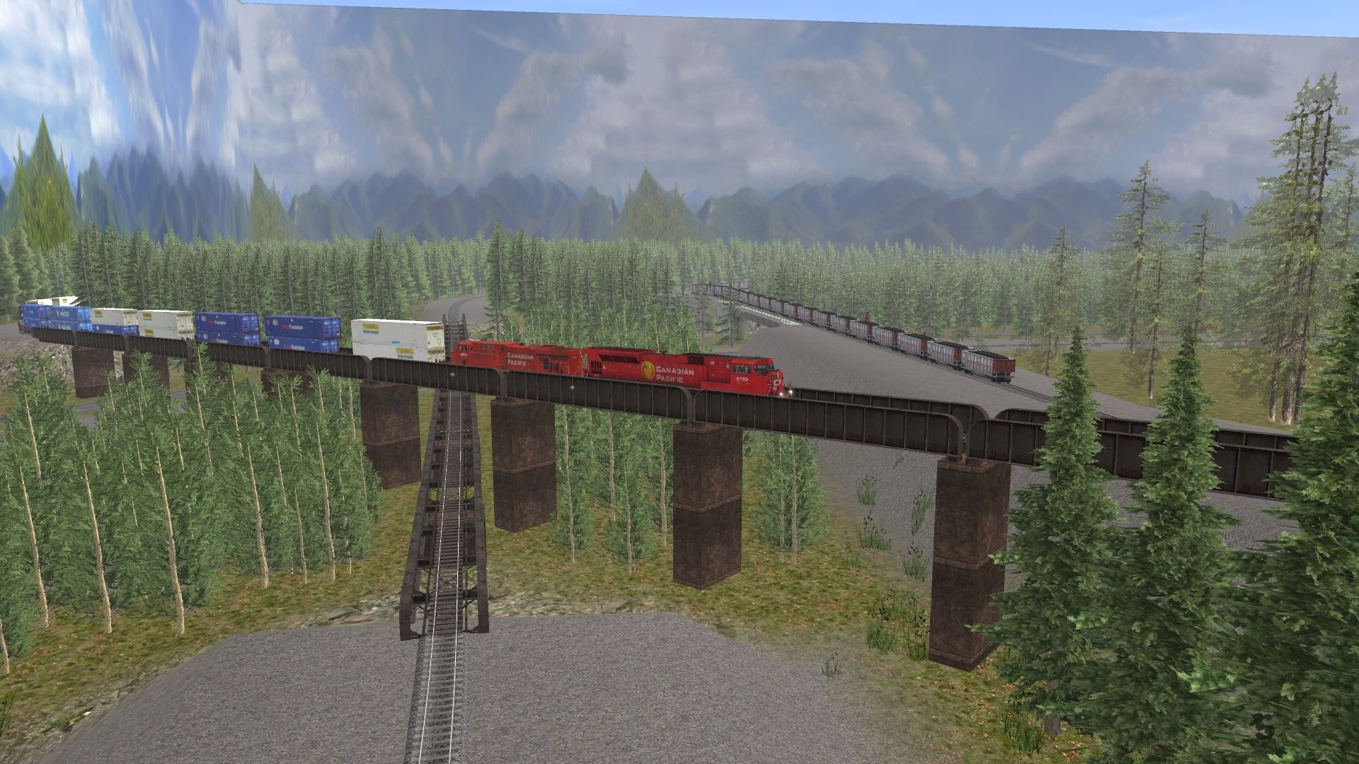 Tags: Trainz: A New Era, Water Route, Bridge Mania, CP SD9043MAC, GE ES44AC CP 8760-8961, GMTX GP40-2, ATSF C30-7, 48 ft Wellcar CP RED 2, CHN X2K container wagon yellow, Custom C80 - Havenwood Southern, HTRX 50ft Boxcar FMC, TankTrain B, SSC P-S 50_6ft Boxcar, TankTrain A